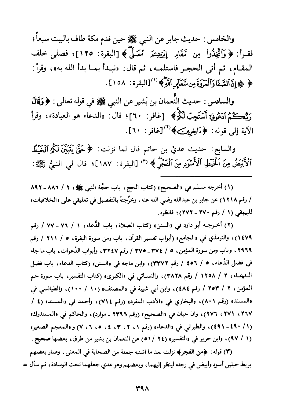 حَدِيثُ جَابِرٍ عَنِ النَّبِيِّ -صَلَّى اللَّهُ عَلَيْهِ وَسَلَّمَ- حِينَ قَدِمَ مَكَّةَ طَافَ بِالْبَيْتِ سَبْعًا؛ فَقَرَأَ: {وَاتَّخِذُوا مِنْ مَقَامِ إِبْرَاهِيمَ مُصَلًّى} [الْبَقَرَةِ: 125] ؛ فَصَلَّى خَلْفَ الْمَقَامِ، ثُمَّ أَتَى الْحَجَرَ فَاسْتَلَمَهُ، ثُمَّ قَالَ: "نَبْدَأُ بِمَا بَدَأَ اللَّهُ بِهِ"، وَقَرَأَ: {إِنَّ الصَّفَا وَالْمَرْوَةَ مِنْ شَعَائِرِ اللَّه} 1 [الْبَقَرَةِ: 158] .