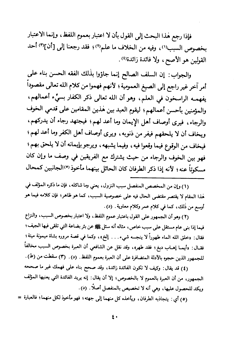 وَالْجَوَابُ: إِنَّ السَّلَفَ الصَّالِحَ إِنَّمَا جَاءُوا بِذَلِكَ الْفِقْهِ الْحَسَنِ بِنَاءً عَلَى أَمْرٍ آخَرَ غَيْرِ رَاجِعٍ إِلَى الصِّيَغِ الْعُمُومِيَّةِ؛ لِأَنَّهُمْ فَهِمُوا مِنْ كَلَامِ اللَّهِ تَعَالَى مَقْصُودًا يَفْهَمُهُ الرَّاسِخُونَ فِي الْعِلْمِ، وَهُوَ أَنَّ اللَّهَ تَعَالَى ذَكَرَ الْكُفَّارَ بِسَيِّئِ أَعْمَالِهِمْ، وَالْمُؤْمِنِينَ بِأَحْسَنِ أَعْمَالِهِمْ؛ لِيَقُومَ الْعَبْدُ بَيْنَ هَذَيْنِ الْمَقَامَيْنِ عَلَى قَدَمَيِ الْخَوْفِ وَالرَّجَاءِ، فَيَرَى أَوْصَافَ أَهْلِ الْإِيمَانِ وَمَا أُعِدَّ لَهُمْ؛ فَيَجْتَهِدُ رَجَاءَ أَنْ يُدْرِكَهُمْ، وَيَخَافُ أَنْ لَا يَلْحَقَهُمْ فَيَفِرَّ مِنْ ذُنُوبِهِ، وَيَرَى أَوْصَافَ أَهْلِ الْكُفْرِ وَمَا أُعِدَّ لَهُمْ؛ فَيَخَافُ مِنَ الْوُقُوعِ فِيمَا وَقَعُوا فِيهِ، وَفِيمَا يُشْبِهُهُ، وَيَرْجُو بِإِيمَانِهِ أَنْ لَا يَلْحَقَ بِهِمْ؛ فَهُوَ بَيْنَ الْخَوْفِ وَالرَّجَاءِ مِنْ حَيْثُ يَشْتَرِكُ مَعَ الْفَرِيقَيْنِ فِي وَصْفٍ مَا وَإِنْ كَانَ مَسْكُوتًا عَنْهُ؛ لِأَنَّهُ إِذَا ذُكِرَ الطَّرَفَانِ كَانَ الحائل بينهما مأخوذ5 الجانبين كمحال