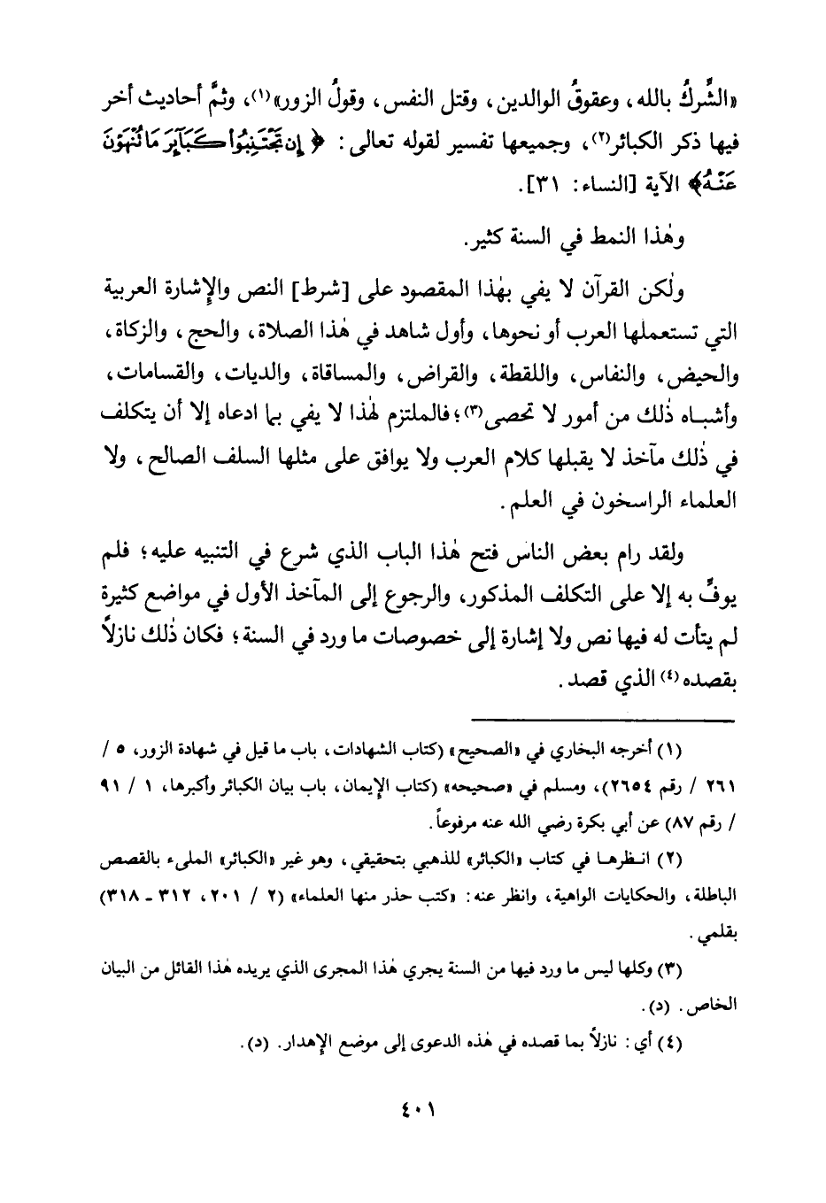 "الشِّرْكُ بِاللَّهِ، وَعُقُوقُ الْوَالِدَيْنِ، وَقَتْلُ النَّفْسِ، وَقَوْلُ الزُّورِ" 1، وَثَمَّ أَحَادِيثُ أُخَرُ فِيهَا ذِكْرُ الْكَبَائِرِ2، وَجَمِيعُهَا تَفْسِيرٌ لِقَوْلِهِ تَعَالَى: {إِنْ تَجْتَنِبُوا كَبَائِرَ مَا تُنْهَوْنَ عَنْهُ} الْآيَةَ [النِّسَاءِ: 31] .