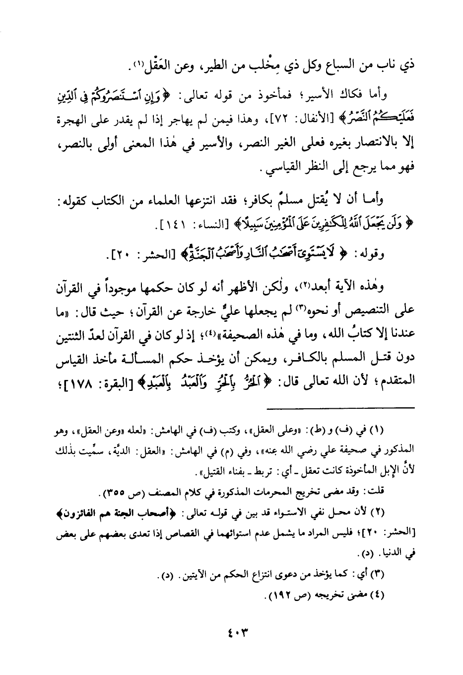 وَهَذِهِ الْآيَةُ أَبْعَدُ2، وَلَكِنَّ الْأَظْهَرَ أَنَّهُ لَوْ كَانَ حُكْمُهَا مَوْجُودًا فِي الْقُرْآنِ عَلَى التَّنْصِيصِ أَوْ نَحْوِهِ3 لَمْ يَجْعَلْهَا عَلِيٌّ خَارِجَةً عَنِ الْقُرْآنِ؛ حَيْثُ قَالَ: "مَا عِنْدَنَا إِلَّا كِتَابُ اللَّهِ، وَمَا فِي هَذِهِ الصَّحِيفَةِ"4؛ إِذْ لَوْ كَانَ فِي الْقُرْآنِ لَعَدَّ الثِّنْتَيْنِ دُونَ قَتْلِ الْمُسْلِمِ بِالْكَافِرِ، وَيُمْكِنُ أَنْ يُؤْخَذَ حُكْمُ الْمَسْأَلَةِ مَأْخَذَ الْقِيَاسِ الْمُتَقَدِّمِ؛ لِأَنَّ اللَّهَ تَعَالَى قَالَ: {الْحُرُّ بِالْحُرِّ وَالْعَبْدُ بِالْعَبْدِ} [البقرة: 178] ؛