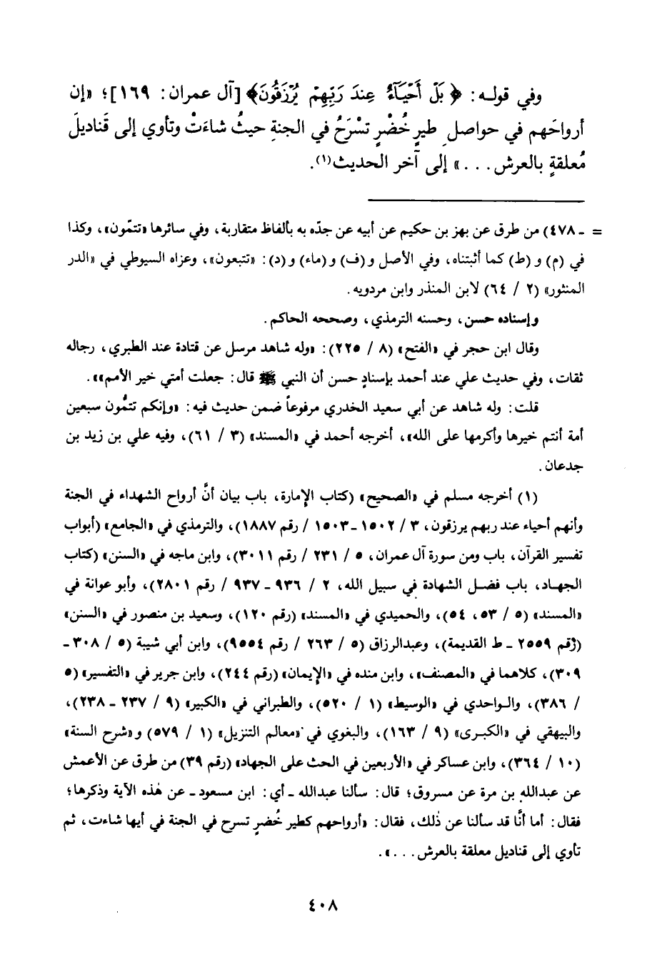وَفِي قَوْلِهِ: {بَلْ أَحْيَاءٌ عِنْدَ رَبِّهِمْ يُرْزَقُون} [آلِ عِمْرَانَ: 169] ؛ "إِنَّ أَرْوَاحَهُمْ فِي حَوَاصِلِ طَيْرٍ خُضْرٍ تَسْرَحُ فِي الْجَنَّةِ حَيْثُ شَاءَتْ وَتَأْوِي إِلَى قَنَادِيلَ مُعَلَّقَةٍ بِالْعَرْشِ...." إِلَى آخِرِ الْحَدِيثِ1.