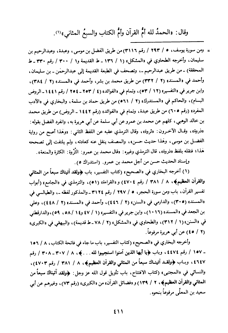 وَقَالَ: "الْحَمْدُ لِلَّهِ أُمُّ الْقُرْآنِ وَأُمُّ الْكِتَابِ والسبع المثاني" 1.