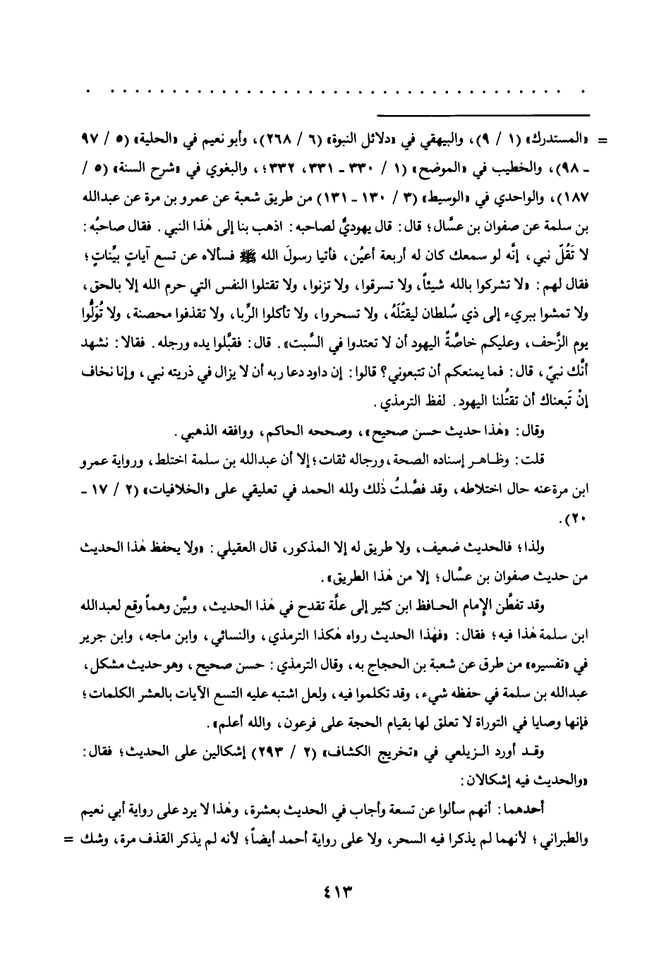 = "المستدرك" "1/ 9"، والبيهقي في دلائل النبوة" "6/ 268"، وأبو نعيم في "الحلية" "5/ 97-98"، والخطيب في "الموضح" "1/ 330-331، 332"، والبغوي في "شرح السنة" "5/ 187"، والواحدي في "الوسيط" "3/ 130-131" من طريق شعبة عن عمرو بن مرة عن عبد الله بن سلمة عن صفوان بن عسال، قال: قال يهودي لصاحبه: اذهب بنا إلى هذا النبي. فقال صاحبه: لا تقل: نبي، إنه لو سمعك كان له أربع أعين، فأتيا رسول الله -صلى الله عليه وسلم- فسألاه عن تسع آيات بينات؛ فقال لهم: "لا تشركوا بالله شيئًا، ولا تسرقوا، ولا تزنوا، ولا تقتلوا النفس التي حرم الله إلا بالحق، ولا تمشوا ببريء إلى ذي سلطان ليقتله، ولا تسحروا، ولا تأكلوا الربا، ولا تقذفوا محصنة، ولا تولوا يوم الزحف، وعليكم خاصة اليهود أن لا تعتدوا في السبت". قال: فقبلوا يده ورجله. فقالا: نشهد أنك نبي، قال: "فما يمنعكم أن تتبعوني؟ " قالوا: إن داود دعا ربه أن لا يزال في ذريته نبي، وإنا نخاف إن تبعناك أن تقتلنا اليهود. لفظ الترمذي.