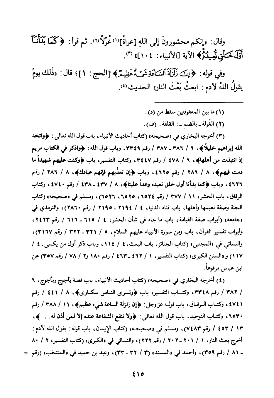 3 أخرجه البخاري في "صحيحه" "كتاب أحاديث الأنبياء، باب قول الله تعالى: {وَاتَّخَذَ اللَّهُ إِبْرَاهِيمَ خَلِيلًا} ، 6/ 386-387/ رقم 3349، وباب قول الله: {وَاذْكُرْ فِي الْكِتَابِ مَرْيَمَ إِذِ انْتَبَذَتْ مِنْ أَهْلِهَا} ، 6/ 478/ رقم 3447، وكتاب التفسير، باب {وَكُنْتُ عَلَيْهِمْ شَهِيدًا مَا دُمْتُ فِيهِم} ، 8/ 286/ رقم 4625، وباب {إِنْ تُعَذِّبْهُمْ فَإِنَّهُمْ عِبَادُك} ، 8/ 286/ رقم 4626، وباب {كَمَا بَدَأْنَا أَوَّلَ خَلْقٍ نُعِيدُهُ وَعْدًا عَلَيْنَا} ، 8/ 437-438/ رقم 4740، وكتاب الرقاق، باب الحشر، 11/ 377/ رقم 6524، 6525، 6526"، ومسلم في "صحيحه" "كتاب الجنة وصفة نعيمها وأهلها، باب فناء الدنيا، 4/ 2194-2195/ رقم 2860"، والترمذي في "جامعه" "أبواب صفة القيامة، باب ما جاء في شأن الحشر، 4/ 615-616/ رقم 2423، وأبواب تفسير القرآن، باب ومن سورة الأنبياء, عليهم السلام، 5/ 321-322/ رقم 3167"، والنسائي في "المجتبى" "كتاب الجنائز، باب البعث، 4/ 114، وباب ذكر ذكر أول من يكسى، 4/ 117" و"السنن الكبرى" "كتاب التفسير، 1/ 462-463/ رقم 180 و2/ 78/ رقم 357" عن ابن عباس مرفوعًا.