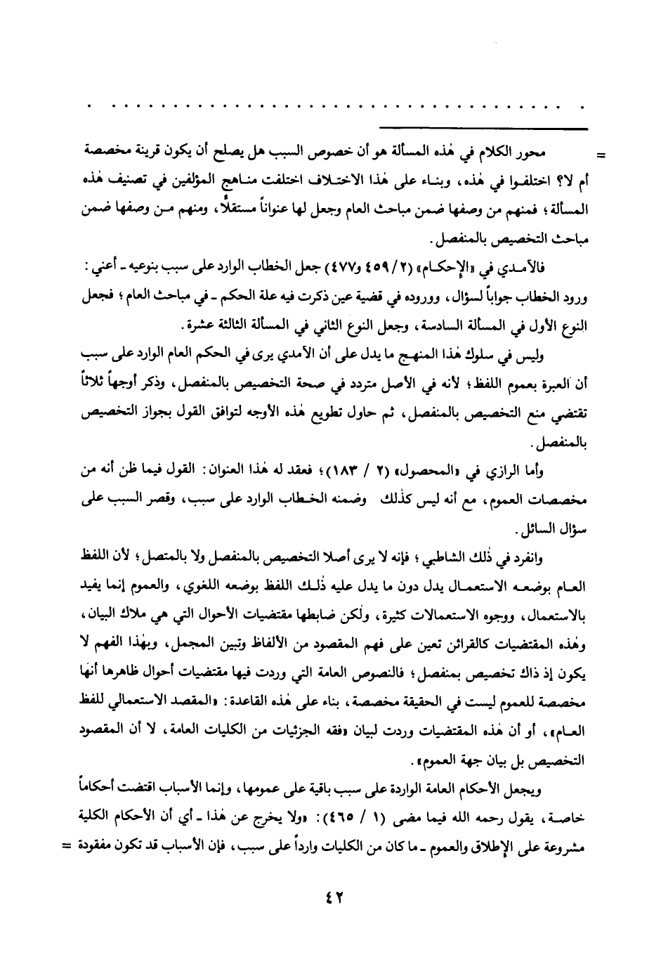 = محور الكلام في هذه المسألة هو أن خصوص السبب هل يصلح أن يكون قرينة مخصصة أم لا؟ اختلفوا في هذه، وبناء على هذا الاختلاف اختلفت مناهج المؤلفين في تصنيف هذه المسألة، فمنهم من وصفها ضمن مباحث العام وجعل لها عنوانًا مستقلًّا، ومنهم من وصفها ضمن مباحث التخصيص بالمنفصل.