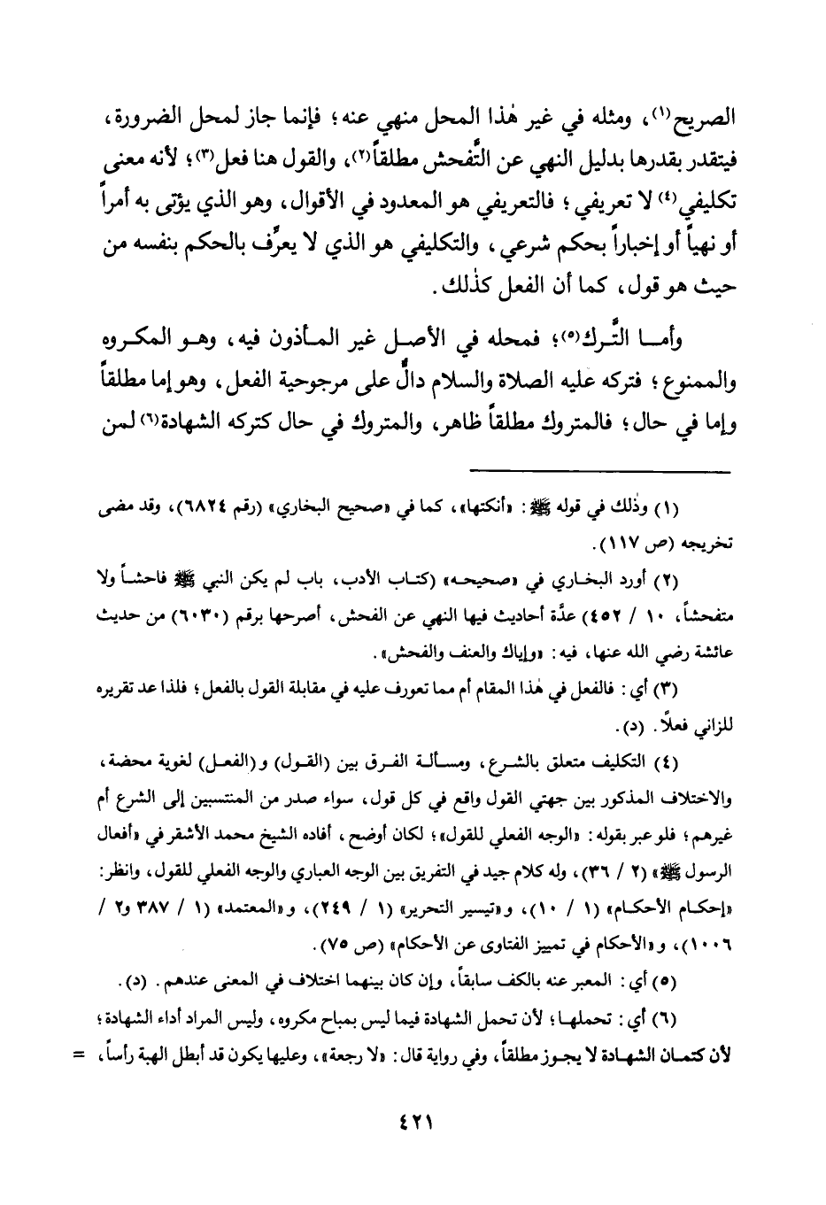 4 التكليف متعلق بالشرع، ومسألة الفرق بين "القول" و"الفعل" لغوية محضة، والاختلاف المذكور بين جهتي القول واقع في كل قول، سواء صدر من المنتسبين إلى الشرع أم غيرهم؛ فلو عبر بقوله: "الوجه الفعلي للقول"؛ لكان أوضح، أفاده الشيخ محمد الأشقر في "أفعال الرسول, صلى الله عليه وسلم" "2/ 36"، وله كلام جيد في التفريق بين الوجه العباري والوجه الفعلي للقول، وانظر: "إحكام الأحكام" "1/ 10"، و"تيسير التحرير" "1/ 249"، و"المعتمد" "1/ 387 و2/ 1006"، و"الأحكام في تمييز الفتاوى عن الأحكام" "ص75".