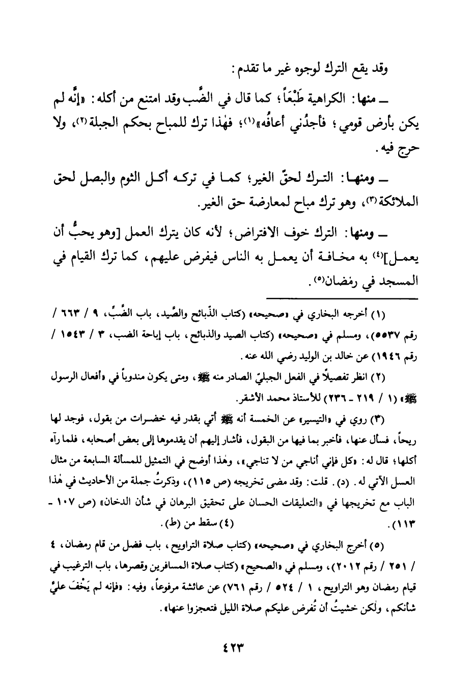 - وَمِنْهَا: التَّرْكُ لِحَقِّ الْغَيْرِ؛ كَمَا فِي تَرْكِهِ أَكْلَ الثُّومِ وَالْبَصَلِ لِحَقِّ الْمَلَائِكَةِ3، وَهُوَ تَرْكُ مُبَاحٍ لِمُعَارَضَةِ حَقِّ الْغَيْرِ.