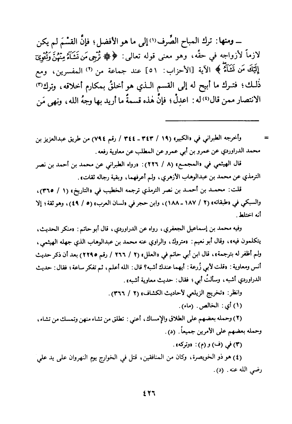 - وَمِنْهَا: تَرْكُ الْمُبَاحِ الصِّرْفِ1 إِلَى مَا هُوَ الْأَفْضَلُ؛ فَإِنَّ الْقَسْمَ لَمْ يَكُنْ لَازِمًا لِأَزْوَاجِهِ فِي حَقِّهِ، وَهُوَ مَعْنَى قَوْلِهِ تَعَالَى: {تُرْجِي مَنْ تَشَاءُ مِنْهُنَّ وَتُؤْوِي إِلَيْكَ مَنْ تَشَاءُ} الْآيَةَ [الْأَحْزَابِ: 51] عِنْدَ جَمَاعَةٍ مِنَ2 الْمُفَسِّرِينَ، وَمَعَ ذَلِكَ؛ فَتَرَكَ مَا أُبِيحَ لَهُ إِلَى الْقَسْمِ الَّذِي هُوَ أَخْلَقُ بِمَكَارِمِ أَخْلَاقِهِ، وَتَرَكَ3 الِانْتِصَارَ مِمَّنْ قَالَ4 لَهُ: اعْدِلْ؛ فَإِنَّ هَذِهِ قِسْمَةٌ مَا أُرِيدَ بِهَا وَجْهُ اللَّهِ، وَنَهَى مَنْ