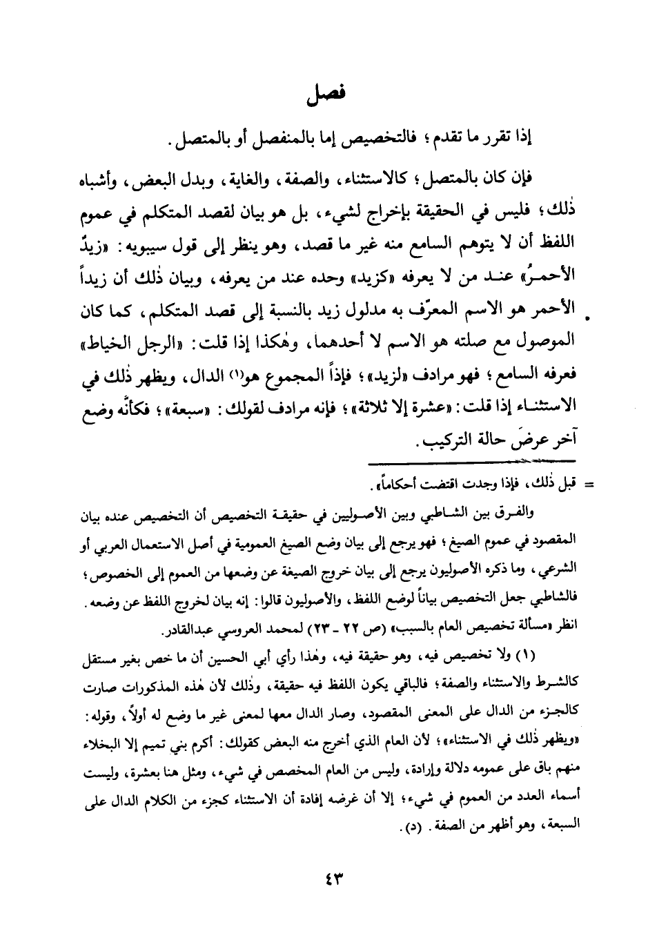 فَإِنْ كَانَ بِالْمُتَّصِلِ؛ كَالِاسْتِثْنَاءِ، وَالصِّفَةِ، وَالْغَايَةِ، وَبَدَلِ الْبَعْضِ، وَأَشْبَاهِ ذَلِكَ؛ فَلَيْسَ فِي الْحَقِيقَةِ بِإِخْرَاجٍ لِشَيْءٍ، بَلْ هُوَ بَيَانٌ لِقَصْدِ الْمُتَكَلِّمِ فِي عُمُومِ اللَّفْظِ أَنْ لَا يَتَوَهَّمَ السَّامِعُ مِنْهُ غَيْرَ مَا قَصَدَ، وَهُوَ يَنْظُرُ إِلَى قَوْلِ سِيبَوَيْهِ: "زَيْدٌ الْأَحْمَرُ" عِنْدَ مَنْ لَا يَعْرِفُهُ "كَزَيْدٍ" وَحْدَهُ عِنْدَ مَنْ يَعْرِفُهُ، وَبَيَانُ ذَلِكَ أَنَّ زَيْدًا الْأَحْمَرَ هُوَ الِاسْمُ الْمُعَرَّفُ بِهِ مَدْلُولُ زِيدٍ بِالنِّسْبَةِ إِلَى قَصْدِ الْمُتَكَلِّمِ، كَمَا كَانَ الْمَوْصُولُ مَعَ صِلَتِهِ هُوَ الِاسْمُ لَا أَحَدُهُمَا، وَهَكَذَا إِذَا قُلْتَ: "الرَّجُلُ الْخَيَّاطُ" فَعَرَفَهُ السَّامِعُ؛ فَهُوَ مُرَادِفٌ "لِزَيْدٍ"؛ فَإِذًا الْمَجْمُوعُ هُوَ1 الدَّالُّ، وَيَظْهَرُ ذَلِكَ فِي الِاسْتِثْنَاءِ إِذَا قُلْتَ: "عَشْرَةٌ إِلَّا ثَلَاثَةً"؛ فَإِنَّهُ مُرَادِفٌ لِقَوْلِكَ: "سَبْعَةٌ"؛ فَكَأَنَّهُ وَضْعٌ آخَرُ عَرَضَ حالة التركيب