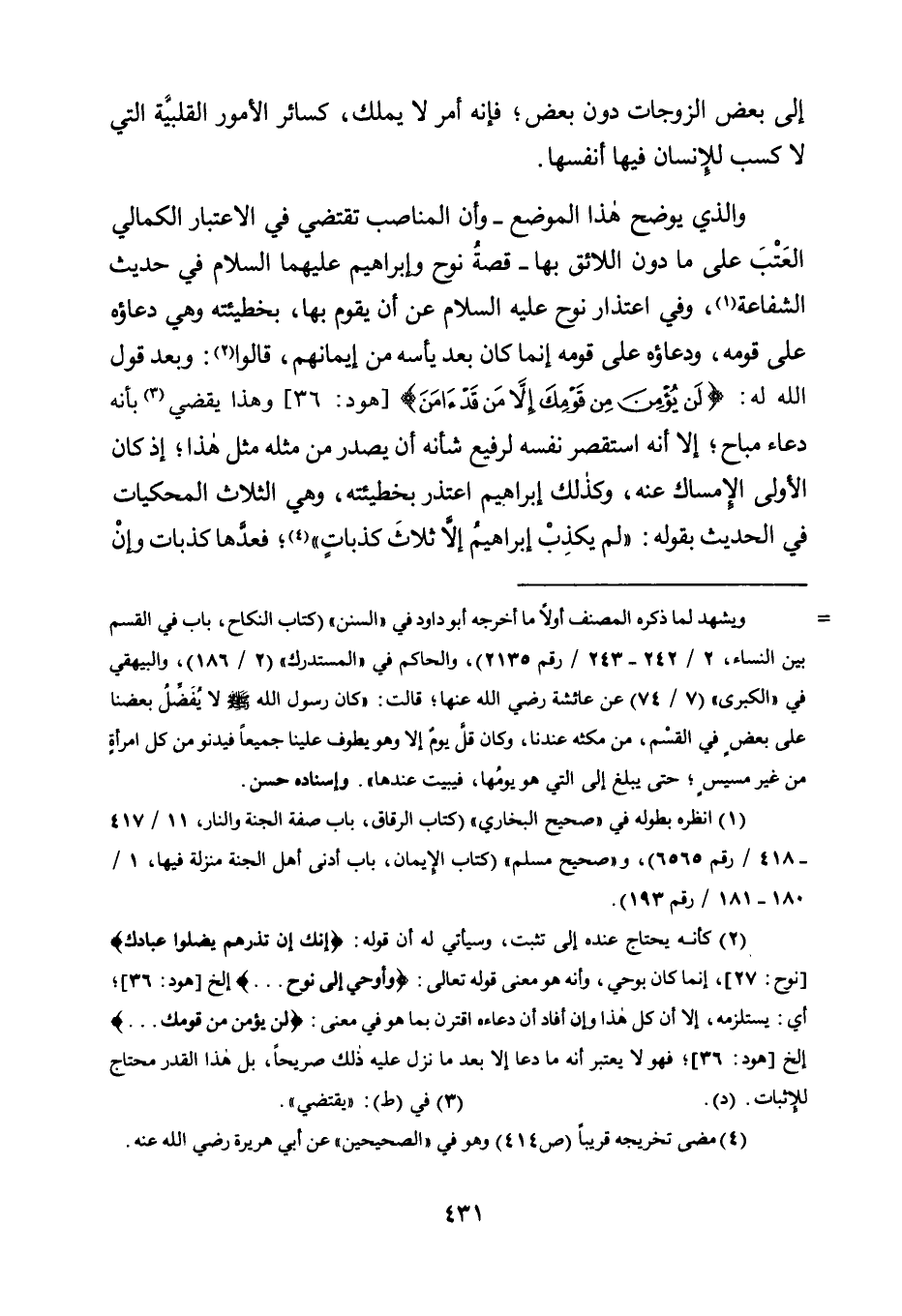 وَالَّذِي يُوَضِّحُ هَذَا الْمَوْضِعَ -وَأَنَّ الْمَنَاصِبَ تَقْتَضِي فِي الِاعْتِبَارِ الْكَمَالِيِّ الْعَتْبَ عَلَى مَا دُونَ اللَّائِقِ بِهَا- قِصَّةُ نُوحٍ وَإِبْرَاهِيمَ -عَلَيْهِمَا السَّلَامُ- فِي حَدِيثِ الشَّفَاعَةِ1، وَفِي اعْتِذَارِ نُوحٍ -عَلَيْهِ السَّلَامُ- عَنْ أَنْ يَقُومَ بِهَا، بِخَطِيئَتِهِ وَهِيَ دُعَاؤُهُ عَلَى قَوْمِهِ, وَدُعَاؤُهُ عَلَى قَوْمِهِ إِنَّمَا كَانَ بَعْدَ يَأْسِهِ مِنْ إِيمَانِهِمْ، قَالُوا2: وَبَعْدَ قَوْلِ اللَّهِ لَهُ: {لَنْ يُؤْمِنَ مِنْ قَوْمِكَ إِلَّا مَنْ قَدْ آمَنَ} [هُودٍ: 36] وَهَذَا يَقْضِي3 بِأَنَّهُ دُعَاءٌ مُبَاحٌ؛ إِلَّا أَنَّهُ اسْتَقْصَرَ نَفْسَهُ لِرَفِيعِ شَأْنِهِ أَنْ يَصْدُرَ مِنْ مِثْلِهِ مِثْلُ هَذَا؛ إِذْ كَانَ الْأَوْلَى الْإِمْسَاكَ عَنْهُ، وَكَذَلِكَ إِبْرَاهِيمُ اعْتَذَرَ بِخَطِيئَتِهِ، وَهِيَ الثَّلَاثُ الْمَحْكِيَّاتُ فِي الْحَدِيثِ بِقَوْلِهِ: "لَمْ يَكْذِبْ إِبْرَاهِيمُ إِلَّا ثَلَاثَ كَذِبَاتٍ"4؛ فَعَدَّهَا كِذْبَاتٍ وإن