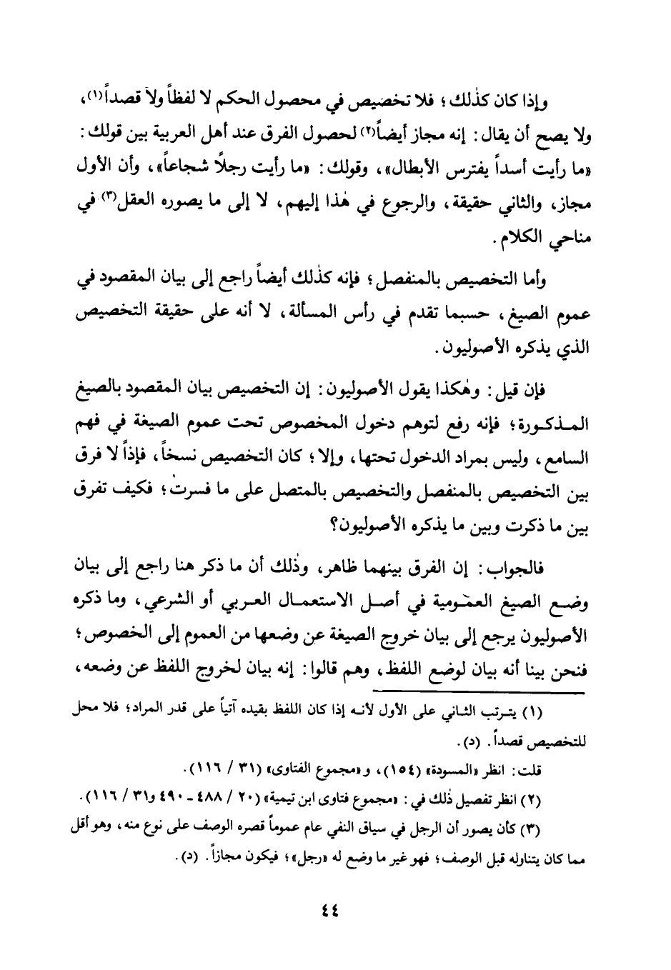 وَإِذَا كَانَ كَذَلِكَ؛ فَلَا تَخْصِيصَ فِي مَحْصُولِ الْحُكْمِ لَا لَفْظًا وَلَا قَصْدًا1، وَلَا يَصِحُّ أَنْ يُقَالَ: إِنَّهُ مُجَازٌ أَيْضًا2 لِحُصُولِ الْفَرْقِ عِنْدَ أَهْلِ الْعَرَبِيَّةِ بَيْنَ قَوْلِكَ: "مَا رَأَيْتُ أَسَدًا يَفْتَرِسُ الْأَبْطَالَ"، وَقَوْلِكَ: "مَا رَأَيْتُ رَجُلًا شُجَاعًا"، وَأَنَّ الْأَوَّلَ مَجَازٌ، وَالثَّانِيَ حَقِيقَةٌ، وَالرُّجُوعُ فِي هَذَا إِلَيْهِمْ، لَا إِلَى مَا يُصَوِّرُهُ الْعَقْلُ3 فِي مَنَاحِي الْكَلَامِ.