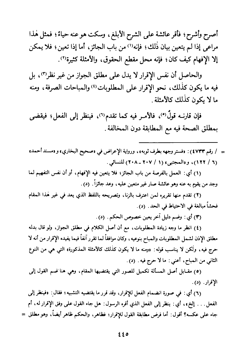 وَالْحَاصِلُ أَنَّ نَفْسَ الْإِقْرَارِ لَا يَدُلُّ عَلَى مُطْلَقِ الْجَوَازِ مِنْ غَيْرِ نَظَرٍ3، بَلْ فِيهِ مَا يَكُونُ كَذَلِكَ نَحْوَ الْإِقْرَارِ عَلَى الْمَطْلُوبَاتِ4 وَالْمُبَاحَاتِ الصِّرْفَةِ وَمِنْهُ مَا لَا يَكُونُ كَذَلِكَ كَالْأَمْثِلَةِ.