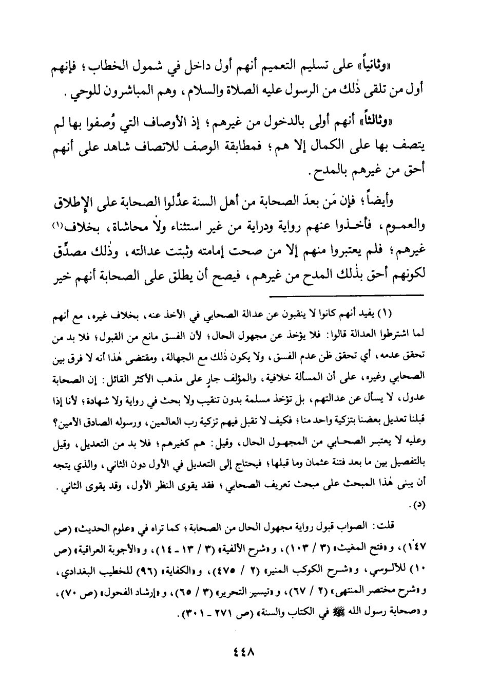 وَأَيْضًا؛ فَإِنَّ مَنْ بَعْدَ الصَّحَابَةِ مِنْ أَهْلِ السُّنَّةِ عَدَلُوا الصَّحَابَةَ عَلَى الْإِطْلَاقِ وَالْعُمُومِ؛ فَأَخَذُوا عَنْهُمْ رِوَايَةً وَدِرَايَةً مِنْ غَيْرِ اسْتِثْنَاءٍ وَلَا مُحَاشَاةٍ، بِخِلَافِ1 غَيْرِهِمْ؛ فَلَمْ يَعْتَبِرُوا مِنْهُمْ إِلَّا مَنْ صَحَّتْ إِمَامَتُهُ وَثَبَتَتْ عَدَالَتُهُ، وَذَلِكَ مُصَدِّقٌ لِكَوْنِهِمْ أَحَقَّ بِذَلِكَ الْمَدْحِ مِنْ غَيْرِهِمْ، فَيَصِحُّ أَنْ يُطْلَقَ عَلَى الصَّحَابَةِ أَنَّهُمْ خير