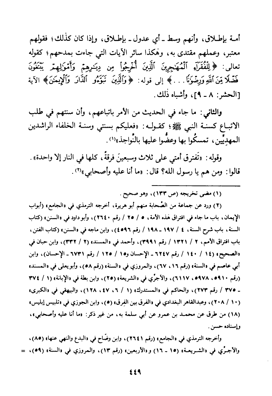 وَقَوْلِهِ: "تَفْتَرِقُ أُمَّتِي عَلَى ثَلَاثٍ وَسَبْعِينَ فِرْقَةً، كُلُّهَا فِي النَّارِ إِلَّا وَاحِدَةً". قَالُوا: وَمَنْ هُمْ يَا رَسُولَ اللَّهِ؟ قَالَ: "ما أنا عليه وأصحابي" 2.