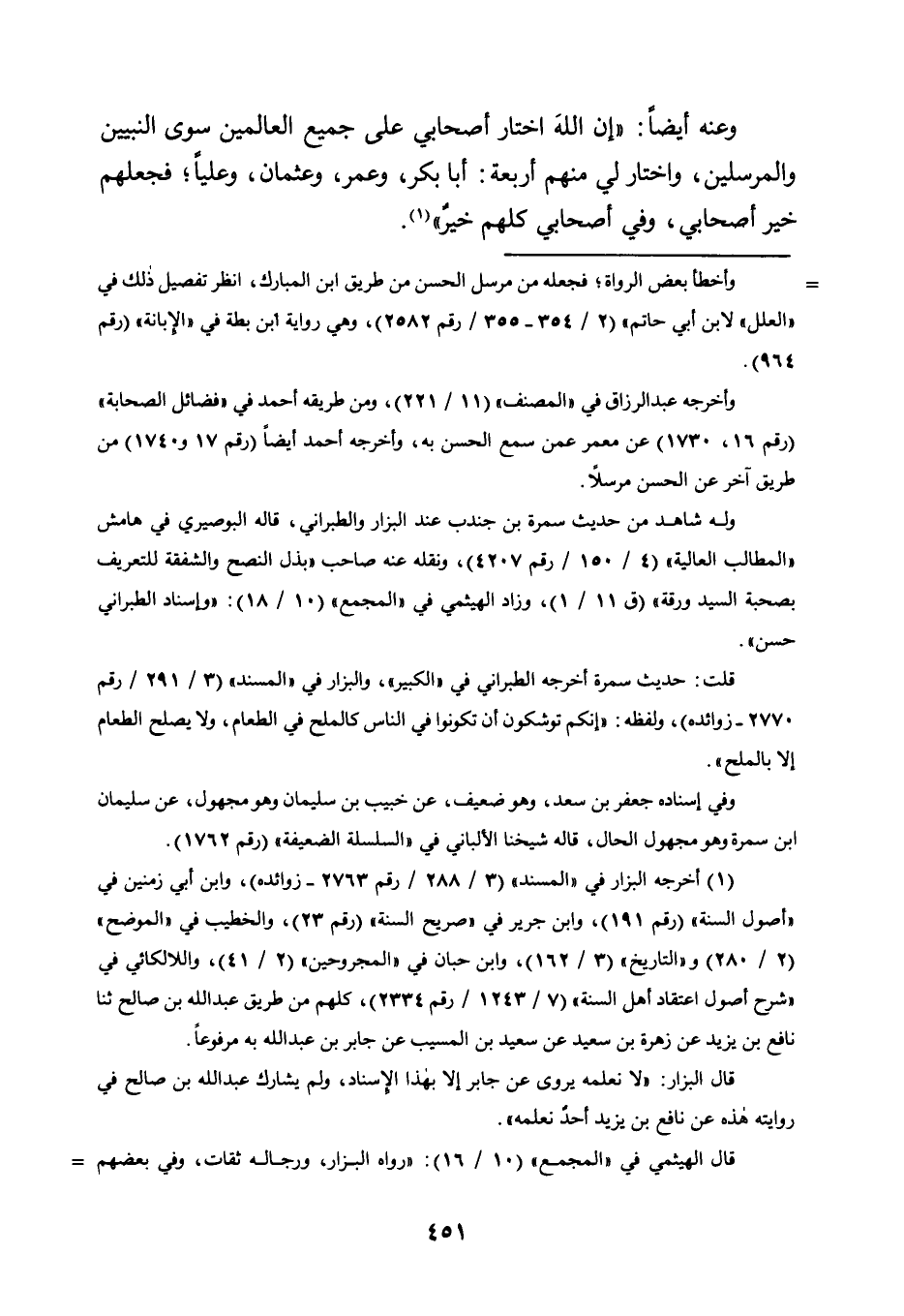 وَعَنْهُ أَيْضًا: "إِنَّ اللَّهَ اخْتَارَ أَصْحَابِي عَلَى جَمِيعِ الْعَالَمِينَ سِوَى النَّبِيِّينَ وَالْمُرْسَلِينَ، وَاخْتَارَ لِي مِنْهُمْ أَرْبَعَةً: أَبَا بَكْرٍ، وَعُمَرَ، وَعُثْمَانَ، وَعَلِيًّا؛ فَجَعَلَهُمْ خَيْرَ أَصْحَابِي، وَفِي أَصْحَابِي كُلِّهِمْ خَيْرٌ" 1.