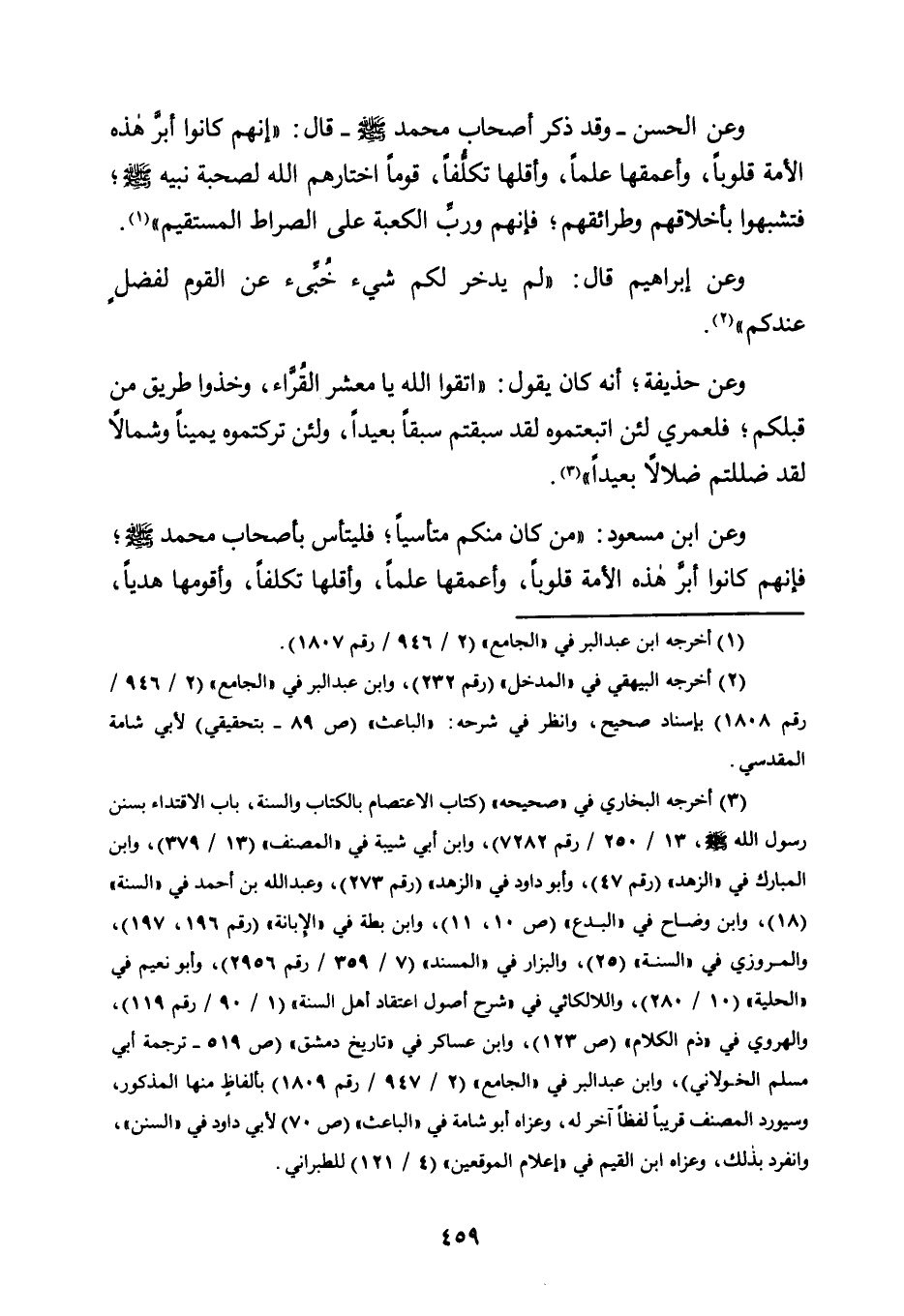 2 أخرجه البيهقي في "المدخل" "رقم 232"، وابن عبد البر في "الجامع" "2/ 946/ رقم 1808" بإسناد صحيح، وانظر في شرحه: "الباعث" "ص89, بتحقيقي" لأبي شامة المقدسي.