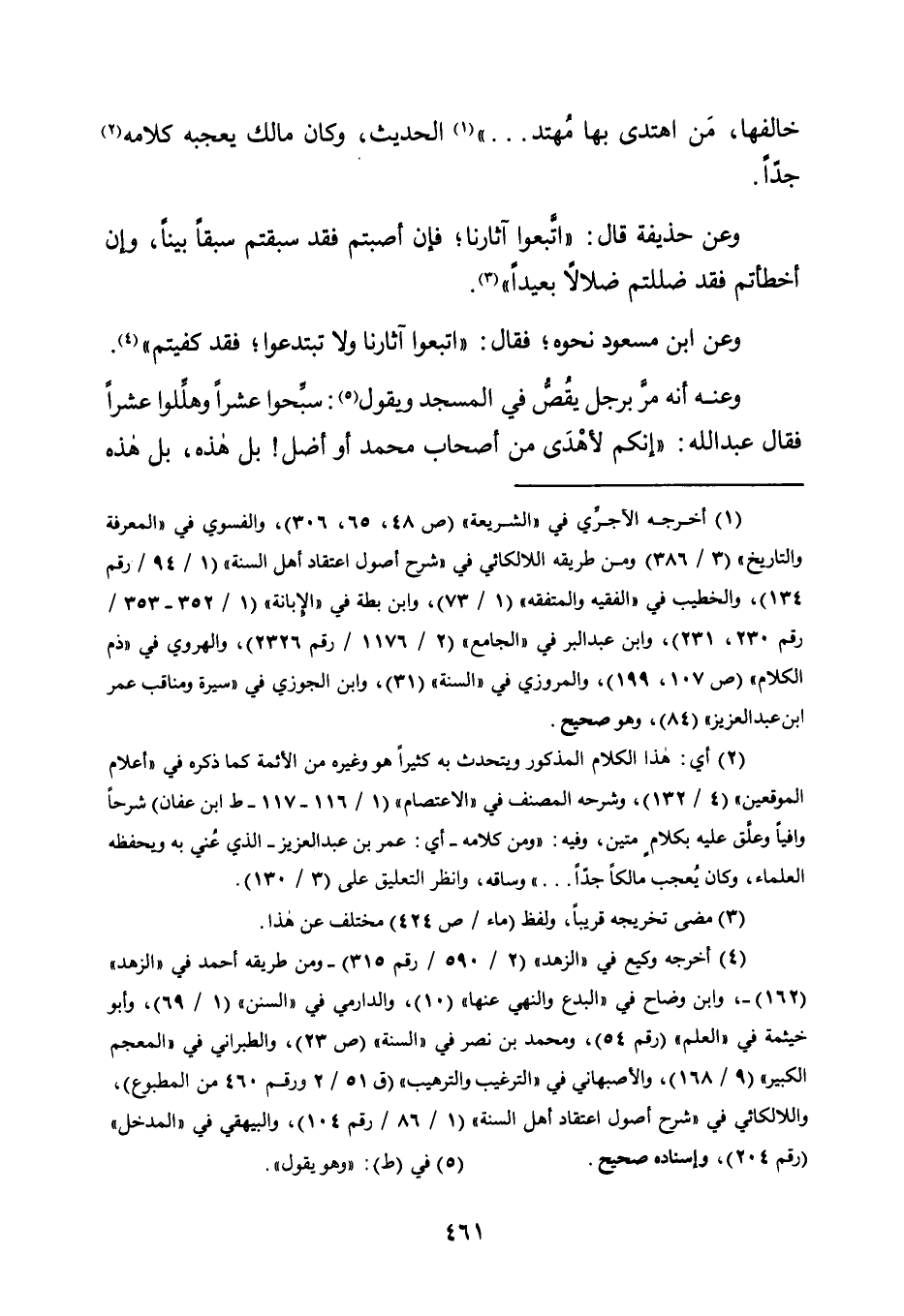 1 أخرجه الآجري في "الشريعة" "ص48، 65، 306"، والفسوي في "المعرفة والتاريخ" "3/ 386" ومن طريقه اللالكائي في "شرح أصول اعتقاد أهل السنة" "1/ 94/ رقم 134"، والخطيب في "الفقيه والمتفقه" "1/ 73"، وابن بطة في "الإبانة" "1/ 352-353/ رقم 230، 231"، وابن عبد البر في "الجامع" "2/ 1176/ رقم 2326"، والهروي في "ذم الكلام" "ص107، 199"، والمروزي في "السنة" "31"، وابن الجوزي في "سيرة ومناقب عمر بن عبد العزيز" "84"، وهو صحيح.