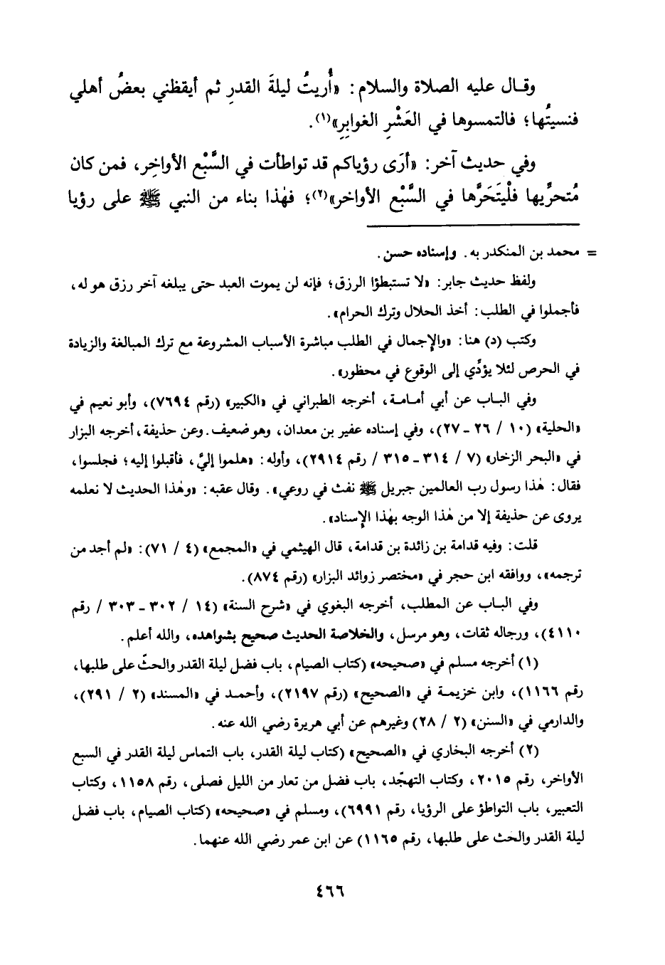 وَقَالَ عَلَيْهِ الصَّلَاةُ وَالسَّلَامُ: "أُرِيتُ لَيْلَةَ الْقَدْرِ ثُمَّ أَيْقَظَنِي بَعْضُ أَهْلِي فَنَسِيتُهَا؛ فَالْتَمِسُوهَا فِي الْعَشْرِ الْغَوَابِرِ" 1.