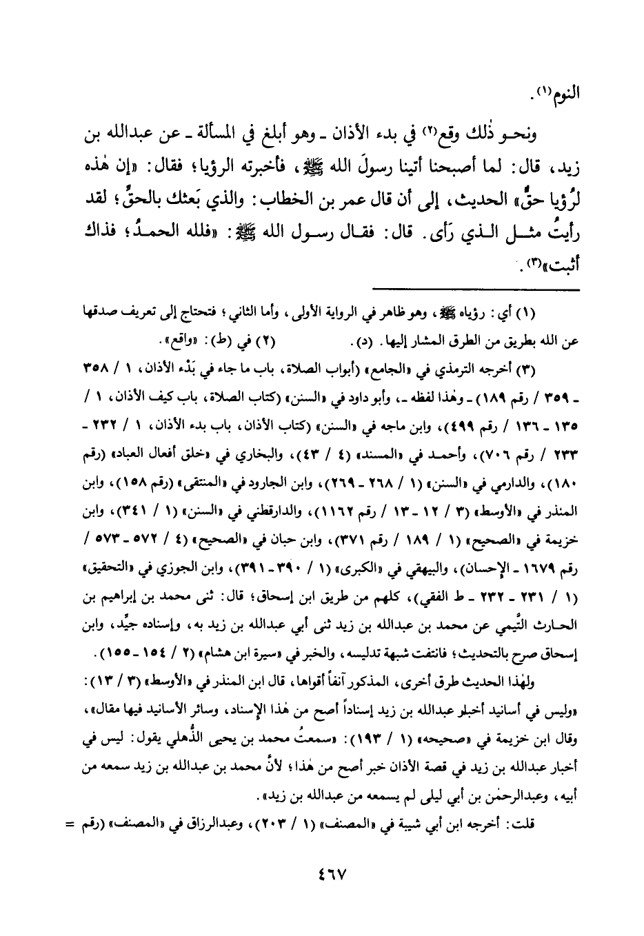 3 أخرجه الترمذي في "الجامع" "أبواب الصلاة، باب ما جاء في بدء الأذان، 1/ 358-359/ رقم 189" -وهذا لفظه- وأبو داود في "السنن" "كتاب الصلاة، باب كيف الأذان، 1/ 135-136/ رقم 499"، وابن ماجه في "السنن" "كتاب الأذان، باب بدء الأذان، 1/ 232-233/ رقم 706"، وأحمد في "المسند" "4/ 43"، والبخاري في "خلق أفعال العباد" "رقم 180"، والدارمي في "السنن" "1/ 268-269"، وابن الجاورد في "المنتقى" "رقم 158"، وابن المنذر في "الأوسط" "3/ 12-13/ رقم 1162"، والدارقطني في "السنن" "1/ 341"، وابن خزيمة في "الصحيح" "1/ 189/ رقم 371"، وابن حبان في "الصحيح" "4/ 572-573/ رقم 1679, الإحسان"، والبيهقي في "الكبرى" "1/ 390-391"، وابن الجوزي في "التحقيق" "1/ 231-232, ط الفقي"، كلهم من طريق ابن إسحاق؛ قال: ثنا محمد بن إبراهيم بن الحارث التيمي عن محمد بن عبد الله بن زيد ثنا أبو عبد الله بن زيد به، وإسناده جيد، وابن إسحاق صرح بالتحديث؛ فانتفت شبهة تدليسه، والخبر في "سيرة ابن هشام" "2/ 154-155".
