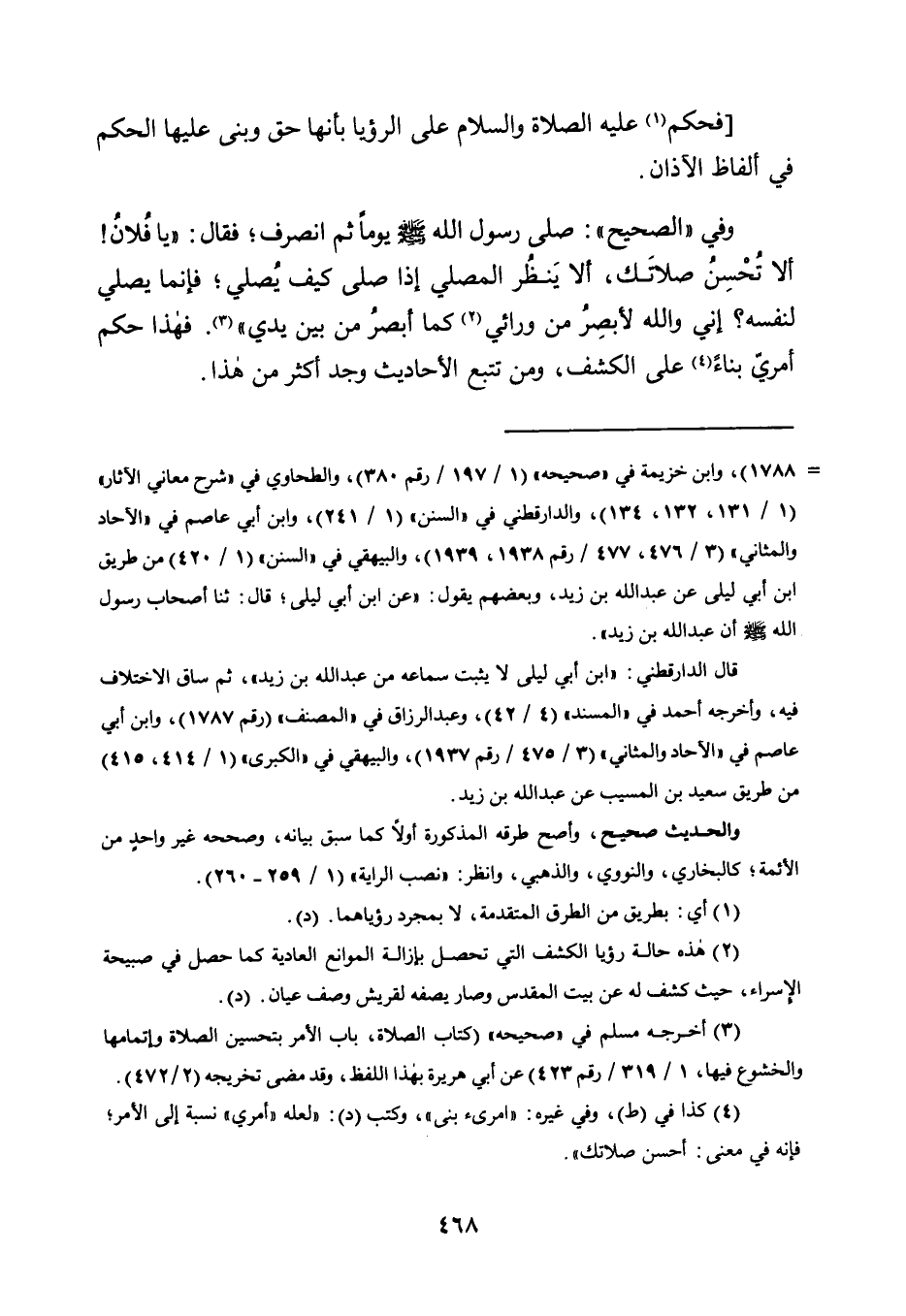 وَفِي "الصَّحِيحِ": صَلَّى رَسُولُ اللَّهِ -صَلَّى اللَّهُ عَلَيْهِ وَسَلَّمَ- يَوْمًا ثُمَّ انْصَرَفَ؛ فَقَالَ: "يَا فُلَانُ! أَلَا تُحْسِنُ صَلَاتَكَ، أَلَا يَنْظُرُ الْمُصَلِّي إِذَا صَلَّى كَيْفَ يُصَلِّي؛ فَإِنَّمَا يُصَلِّي لِنَفْسِهِ؟ إِنِّي وَاللَّهِ لَأُبْصِرُ مِنْ وَرَائِي 2 كَمَا أُبْصِرُ مِنْ بَيْنِ يَدَيَّ" 3. فَهَذَا حُكْمٌ أَمْرِيٌّ بِنَاءً4 عَلَى الْكَشْفِ، وَمَنْ تَتَبَّعَ الْأَحَادِيثَ وَجَدَ أَكْثَرَ من هذا.