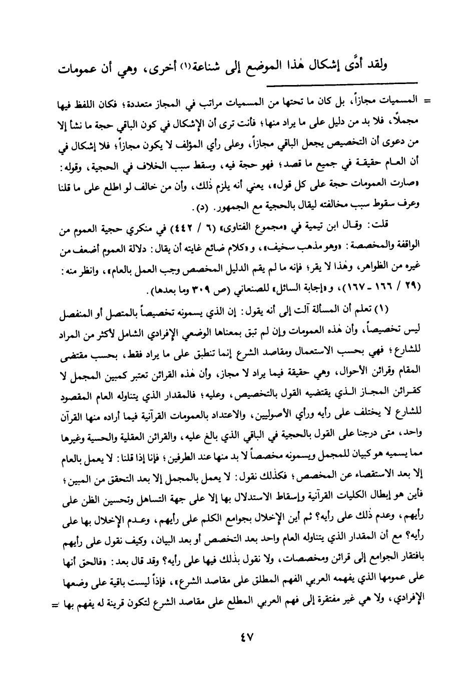 وَلَقَدْ أَدَّى إِشْكَالُ هَذَا الْمَوْضِعِ إِلَى شَنَاعَةٍ1 أخرى، وهي أن عمومات