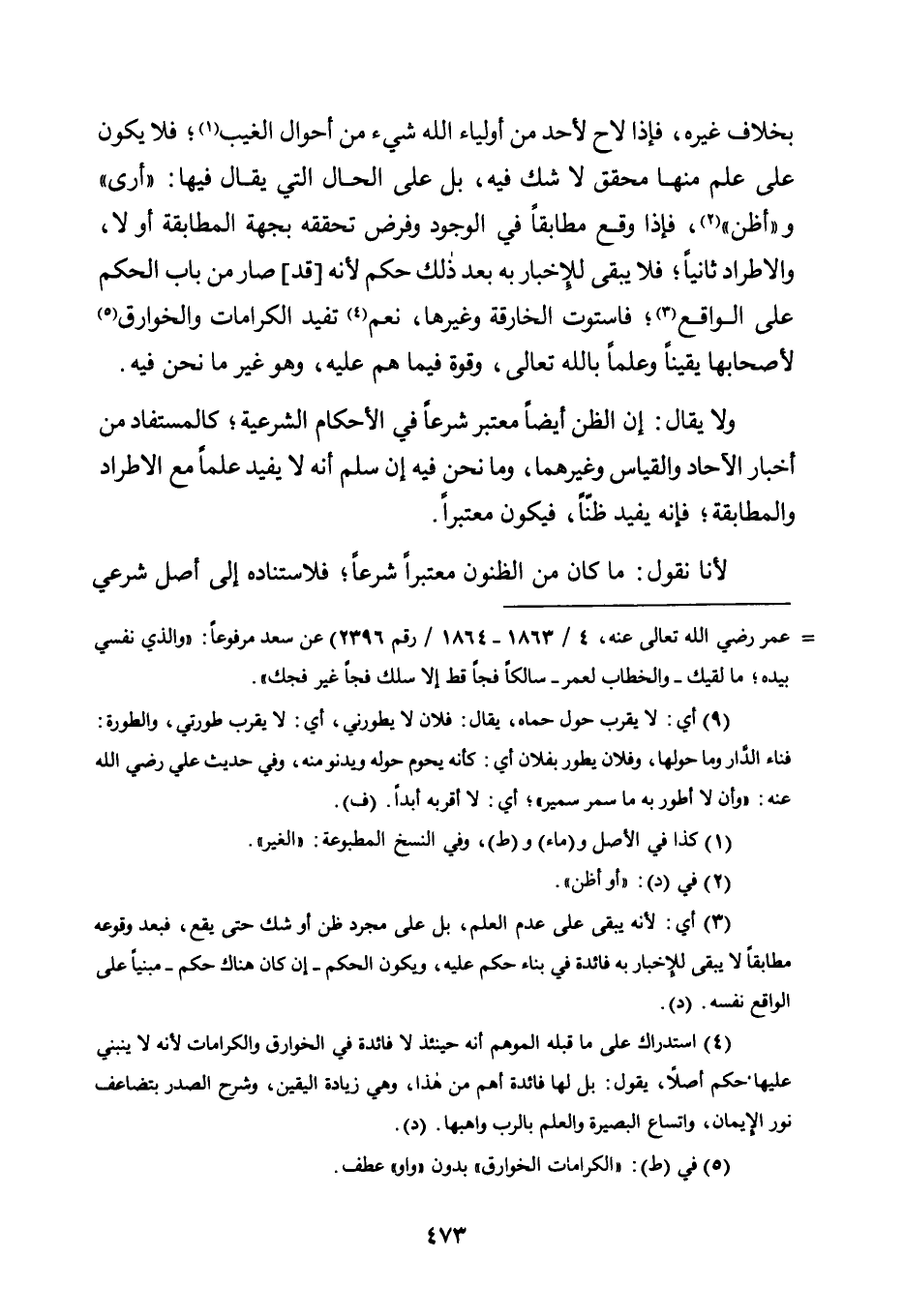 بِخِلَافِ غَيْرِهِ، فَإِذَا لَاحَ لِأَحَدٍ مِنْ أَوْلِيَاءِ اللَّهِ شَيْءٌ مِنْ أَحْوَالِ الْغَيْبِ1؛ فَلَا يَكُونُ عَلَى عِلْمٍ مِنْهَا مُحَقَّقٍ لَا شَكَّ فِيهِ، بَلْ عَلَى الْحَالِ الَّتِي يُقَالُ فِيهَا: "أَرَى" وَ"أَظُنُّ"2، فَإِذَا وَقَعَ مُطَابِقًا فِي الْوُجُودِ وَفُرِضَ تَحَقُّقُهُ بِجِهَةِ الْمُطَابَقَةِ أَوَّلًا، وَالِاطِّرَادِ ثَانِيًا؛ فَلَا يَبْقَى لِلْإِخْبَارِ بِهِ بَعْدَ ذَلِكَ حُكْمٌ لأنه [قد] صَارَ مِنْ بَابِ الْحُكْمِ عَلَى الْوَاقِعِ3؛ فَاسْتَوَتِ الْخَارِقَةُ وَغَيْرُهَا، نَعَمْ4 تُفِيدُ الْكَرَامَاتُ وَالْخَوَارِقُ5 لِأَصْحَابِهَا يَقِينًا وَعِلْمًا بِاللَّهِ تَعَالَى، وَقُوَّةً فِيمَا هُمْ عَلَيْهِ، وَهُوَ غَيْرُ مَا نَحْنُ فِيهِ.