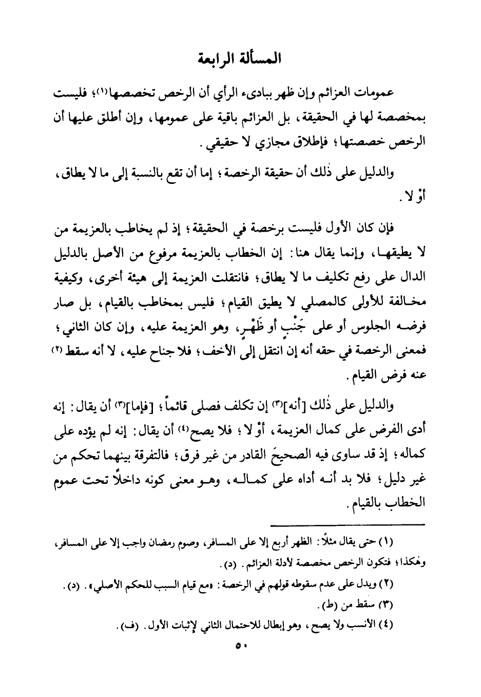 فَإِنْ كَانَ الْأَوَّلَ فَلَيْسَتْ بِرُخْصَةٍ فِي الْحَقِيقَةِ؛ إِذْ لَمْ يُخَاطَبْ بِالْعَزِيمَةِ مَنْ لَا يُطِيقُهَا، وَإِنَّمَا يُقَالُ هُنَا: إِنَّ الْخِطَابَ بِالْعَزِيمَةِ مَرْفُوعٌ مِنَ الْأَصْلِ بِالدَّلِيلِ الدَّالِّ عَلَى رَفْعِ تَكْلِيفِ مَا لَا يُطَاقُ؛ فَانْتَقَلَتِ الْعَزِيمَةُ إِلَى هَيْئَةٍ أُخْرَى، وَكَيْفِيَّةٍ مُخَالِفَةٍ لِلْأَوْلَى كَالْمُصَلِّي لَا يُطِيقُ الْقِيَامَ؛ فَلَيْسَ بِمُخَاطَبٍ بِالْقِيَامِ، بَلْ صَارَ فَرْضُهُ الْجُلُوسَ أَوْ عَلَى جَنْبٍ أَوْ ظَهْرٍ، وَهُوَ الْعَزِيمَةُ عَلَيْهِ، وَإِنْ كَانَ الثَّانِي؛ فَمَعْنَى الرُّخْصَةُ فِي حَقِّهِ أَنَّهُ إِنِ انْتَقَلَ إِلَى الْأَخَفِّ؛ فَلَا جُنَاحَ عَلَيْهِ، لَا أَنَّهُ سَقَطَ2 عَنْهُ فَرْضُ الْقِيَامِ.
