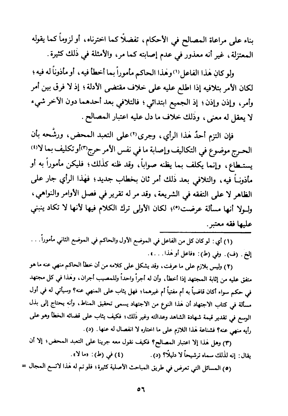 بِنَاءً عَلَى مُرَاعَاةِ الْمَصَالِحِ فِي الْأَحْكَامِ، تَفَضُّلًا كَمَا اخْتَرْنَاهُ، أَوْ لُزُومًا كَمَا يَقُولُهُ الْمُعْتَزِلَةُ، غَيْرَ أَنَّهُ مَعْذُورٌ فِي عَدَمِ إِصَابَتِهِ كَمَا مَرَّ، وَالْأَمْثِلَةُ فِي ذَلِكَ كَثِيرَةٌ.