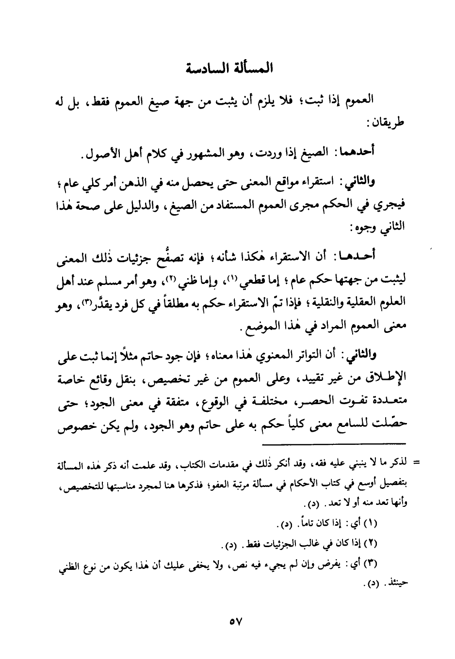 أَحَدُهَا: أَنَّ الِاسْتِقْرَاءَ هَكَذَا شَأْنُهُ؛ فَإِنَّهُ تصفُّح جُزْئِيَّاتِ ذَلِكَ الْمَعْنَى لِيَثْبُتَ مِنْ جِهَتِهَا حُكْمٌ عَامٌّ؛ إِمَّا قَطْعِيٌّ1، وَإِمَّا ظَنِّيٌّ2، وَهُوَ أَمْرٌ مُسَلَّمٌ عِنْدَ أَهْلِ الْعُلُومِ الْعَقْلِيَّةِ وَالنَّقْلِيَّةِ؛ فَإِذَا تَمَّ الِاسْتِقْرَاءُ حُكِمَ بِهِ مُطْلَقًا فِي كُلِّ فَرْدٍ يُقَدَّرُ3، وَهُوَ مَعْنَى الْعُمُومِ الْمُرَادُ فِي هَذَا الْمَوْضِعِ.