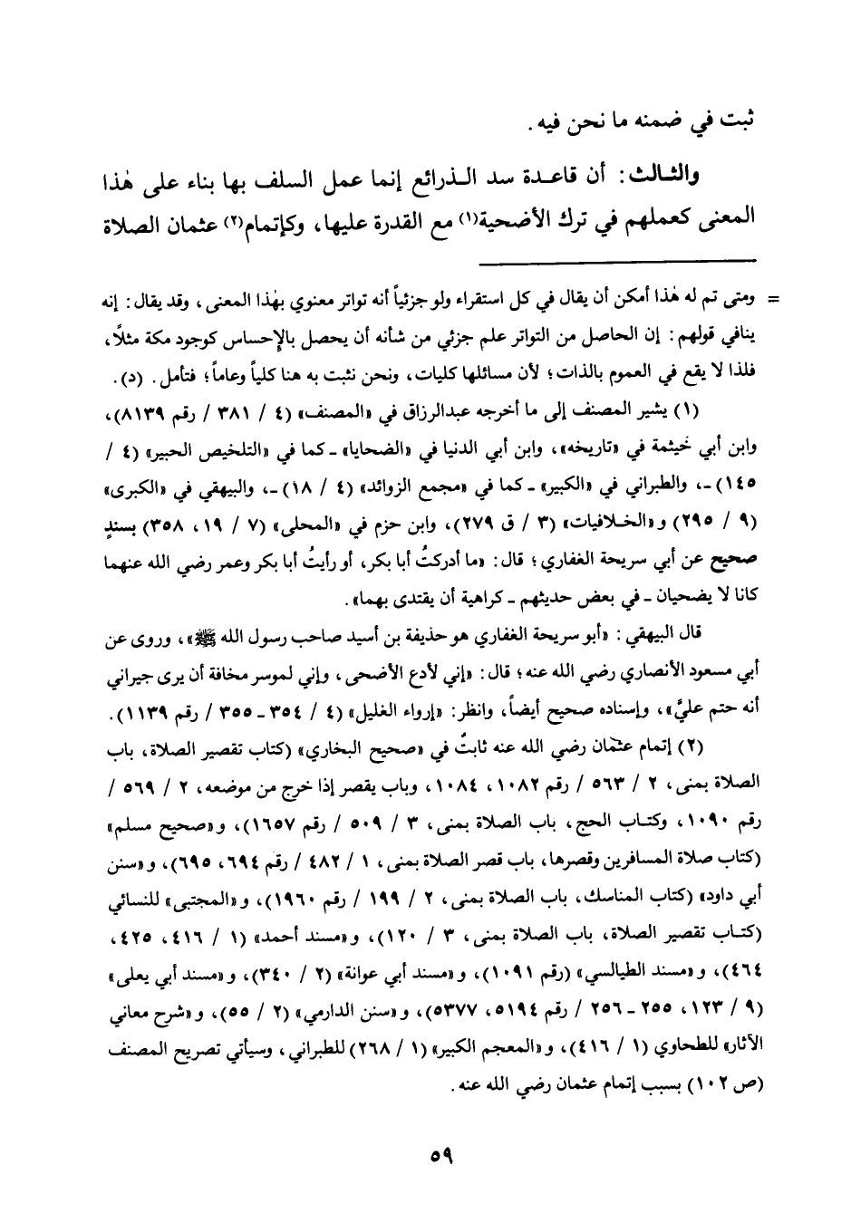 وَالثَّالِثُ: أَنَّ قَاعِدَةَ سَدِّ الذَّرَائِعِ إِنَّمَا عَمِلَ السَّلَفُ بِهَا بِنَاءً عَلَى هَذَا الْمَعْنَى كَعَمَلِهِمْ فِي تَرْكِ الْأُضْحِيَّةِ1 مَعَ الْقُدْرَةِ عَلَيْهَا، وَكَإِتْمَامِ2 عُثْمَانَ الصلاة