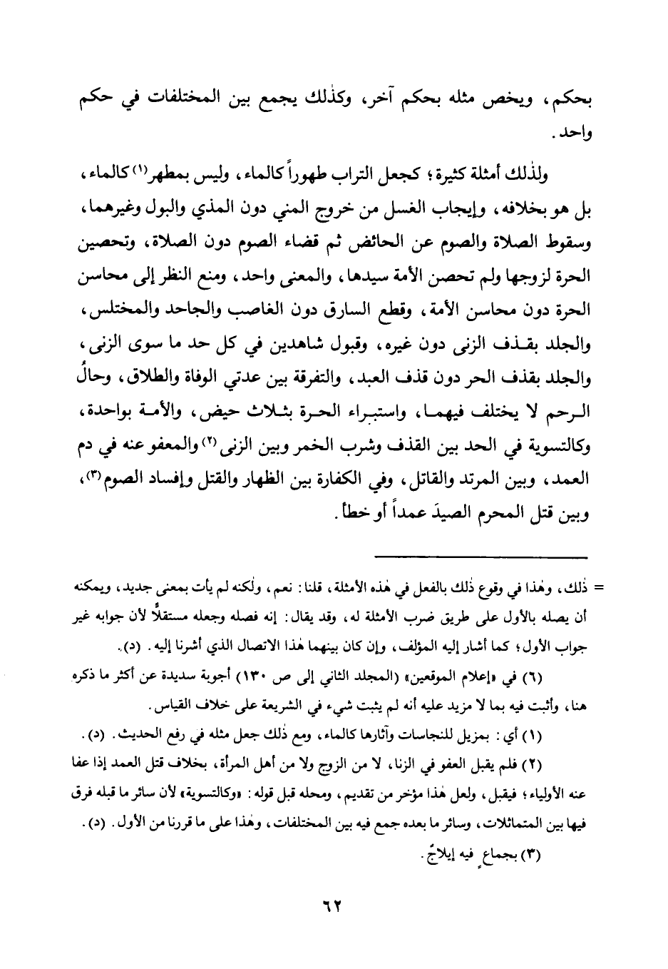 وَلِذَلِكَ أَمْثِلَةٌ كَثِيرَةٌ؛ كَجَعْلِ التُّرَابِ طَهُورًا كَالْمَاءِ، وَلَيْسَ بِمُطَهِّرٍ1 كَالْمَاءِ، بَلْ هُوَ بِخِلَافِهِ، وَإِيجَابِ الْغُسْلِ مِنْ خُرُوجِ الْمَنِيِّ دُونَ الْمَذْيِ وَالْبَوْلِ وَغَيْرِهِمَا، وَسُقُوطِ الصَّلَاةِ وَالصَّوْمِ عَنِ الْحَائِضِ ثُمَّ قَضَاءِ الصَّوْمِ دُونَ الصَّلَاةِ، وَتَحْصِينِ الْحُرَّةِ لِزَوْجِهَا وَلَمْ تُحْصِنِ الْأَمَةُ سَيِّدَهَا، وَالْمَعْنَى وَاحِدٌ، وَمَنْعِ النَّظَرِ إِلَى مَحَاسِنِ الْحُرَّةِ دُونَ مَحَاسِنِ الْأَمَةِ، وَقَطْعِ السَّارِقِ دُونَ الْغَاصِبِ وَالْجَاحِدِ وَالْمُخْتَلِسِ، وَالْجَلْدِ بِقَذْفِ الزِّنَى دُونَ غَيْرِهِ، وَقَبُولِ شَاهِدَيْنِ فِي كُلِّ حَدٍّ مَا سِوَى الزِّنَى، وَالْجَلْدِ بِقَذْفِ الْحُرِّ دُونَ قَذْفِ الْعَبْدِ، وَالتَّفْرِقَةِ بَيْنَ عِدَّتَيِ الْوَفَاةِ وَالطَّلَاقِ، وحالُ الرَّحِمِ لَا يُخْتَلَفُ فِيهِمَا، وَاسْتِبْرَاءِ الْحُرَّةِ بِثَلَاثِ حِيَضٍ، وَالْأَمَةِ بِوَاحِدَةٍ، وَكَالتَّسْوِيَةِ فِي الْحَدِّ بَيْنَ الْقَذْفِ وَشُرْبِ الْخَمْرِ وَبَيْنَ الزِّنَى2 وَالْمَعْفُوِّ عَنْهُ فِي دَمِ الْعَمْدِ، وَبَيْنَ الْمُرْتَدِّ وَالْقَاتِلِ، وَفِي الْكَفَّارَةِ بَيْنَ الظِّهَارِ وَالْقَتْلِ وَإِفْسَادِ الصَّوْمِ3، وَبَيْنَ قَتْلِ الْمُحْرِمِ الصَّيْدَ عَمْدًا أَوْ خَطَأً.