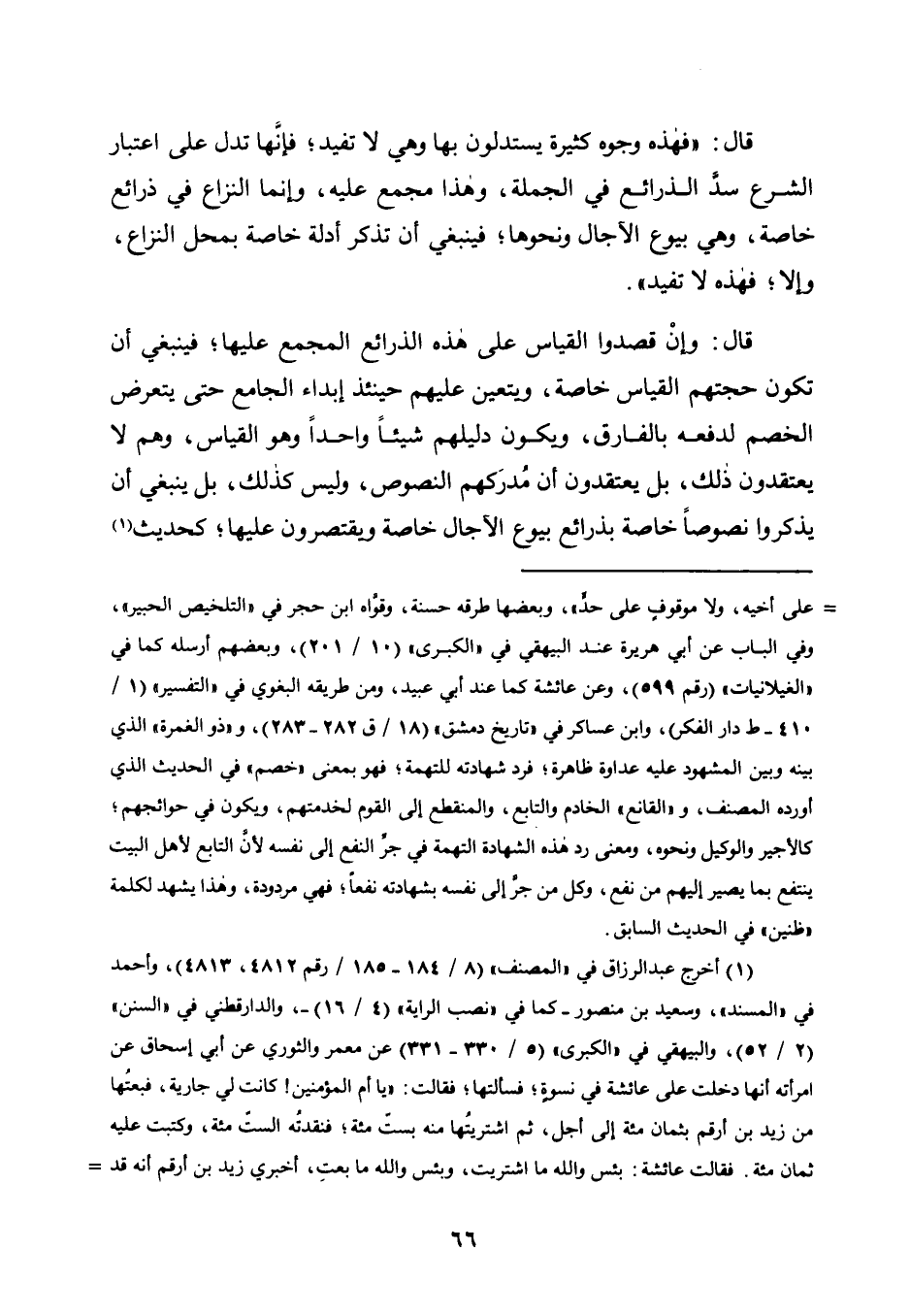 قَالَ: وَإِنْ قَصَدُوا الْقِيَاسَ عَلَى هَذِهِ الذَّرَائِعِ الْمُجْمَعِ عَلَيْهَا؛ فَيَنْبَغِي أَنْ تَكُونَ حُجَّتُهُمُ الْقِيَاسَ خَاصَّةً، وَيَتَعَيَّنُ عَلَيْهِمْ حِينَئِذٍ إِبْدَاءُ الْجَامِعِ حَتَّى يَتَعَرَّضَ الْخَصْمُ لِدَفْعِهِ بِالْفَارِقِ، وَيَكُونُ دَلِيلُهُمْ شَيْئًا وَاحِدًا وَهُوَ الْقِيَاسُ، وَهُمْ لَا يَعْتَقِدُونَ ذَلِكَ، بَلْ يَعْتَقِدُونَ أَنَّ مُدْرَكَهُمُ النُّصُوصَ، وَلَيْسَ كَذَلِكَ، بَلْ يَنْبَغِي أَنْ يَذْكُرُوا نُصُوصًا خَاصَّةً بِذَرَائِعَ بُيُوعِ الآجال خاصة ويقتصرون عليها؛ كحديث1