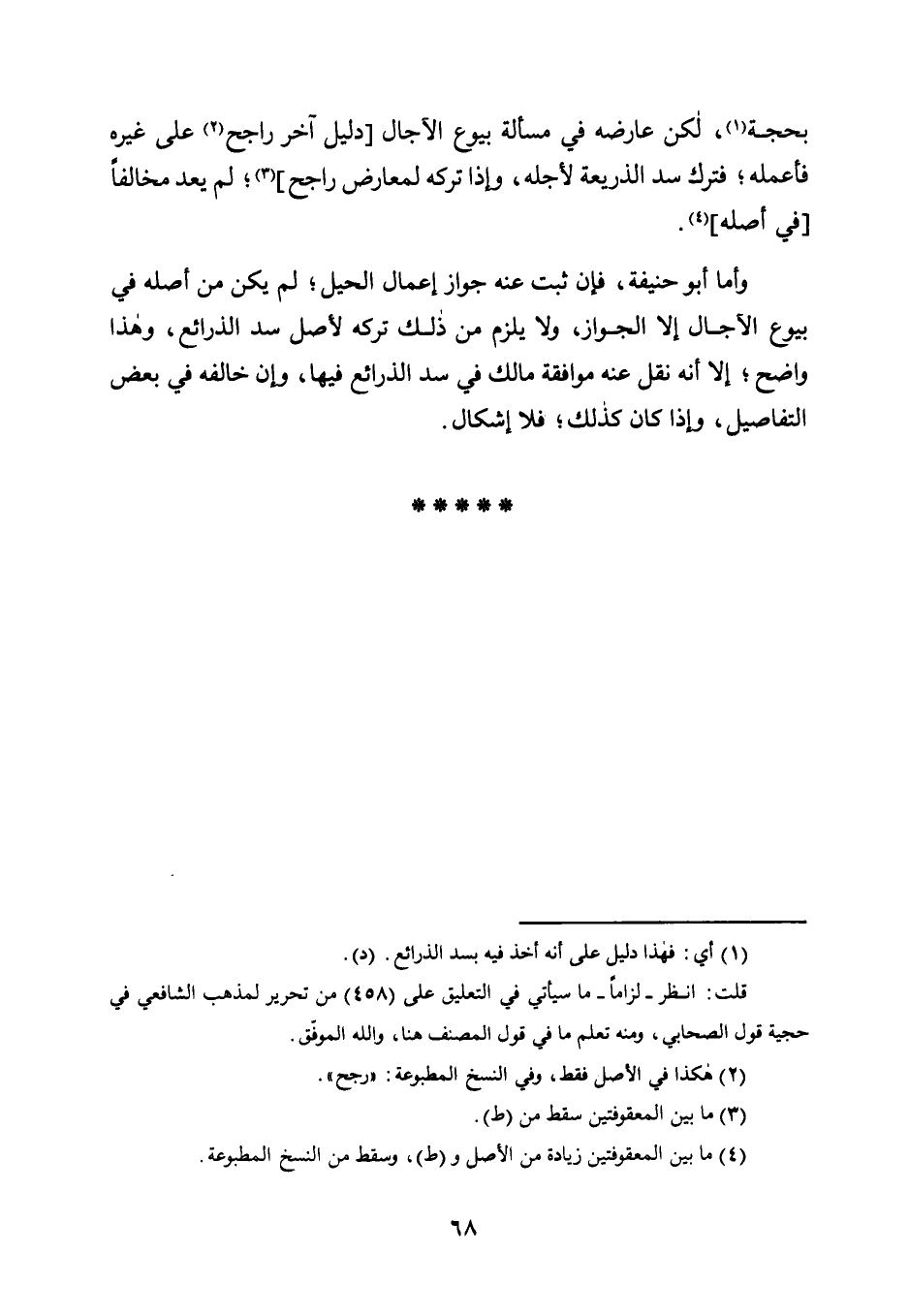 بِحُجَّةٍ1، لَكِنْ عَارَضَهُ فِي مَسْأَلَةِ بُيُوعِ الْآجَالِ [دَلِيلٌ آخَرُ رَاجِحٌ2 عَلَى غَيْرِهِ فَأَعْمَلَهُ؛ فَتَرَكَ سَدَّ الذَّرِيعَةِ لِأَجْلِهِ، وَإِذَا تَرَكَهُ لِمُعَارِضٍ رَاجِحٍ] 3؛ لَمْ يُعَدَّ مُخَالِفًا [فِي أَصْلِهِ] 4.