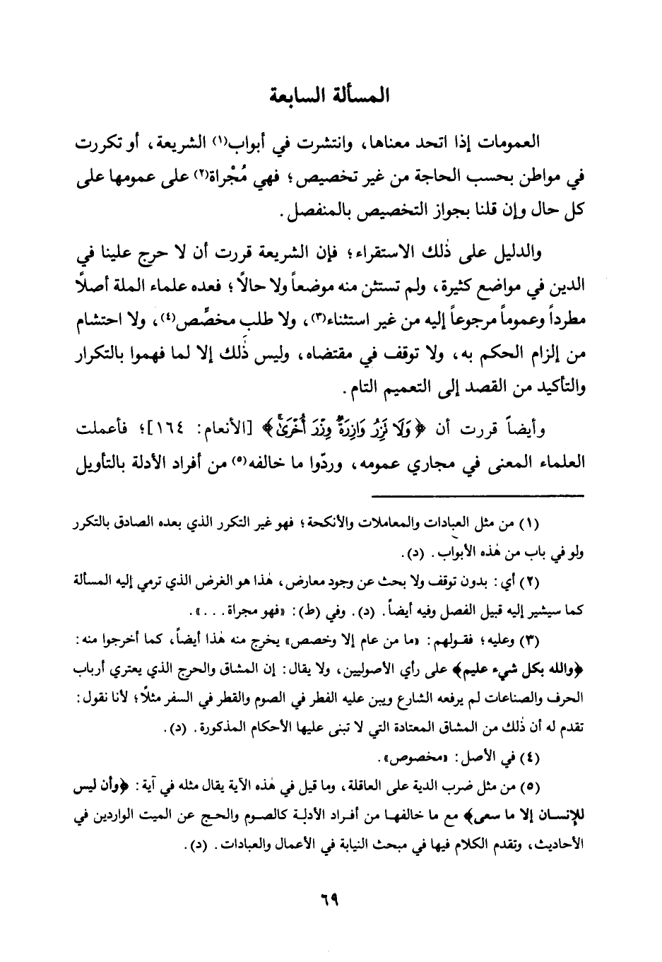 3 وعليه؛ فقولهم: "ما من عام إلا وخصص" يخرج منه هذا أيضًا، كما أخرجوا منه: {وَاللَّهُ بِكُلِّ شَيْءٍ عَلِيم} على رأي الأصوليين، ولا يقال: إن المشاق والحرج الذي يعتري أرباب الحرف والصناعات لم يرفعه الشارع ويبن عليه الفطر في الصوم والقطر في السفر مثلًا؛ لأنا نقول: تقدم له أن ذلك من المشاق المعتادة التي لا تبنى عليها الأحكام المذكورة. "د".
