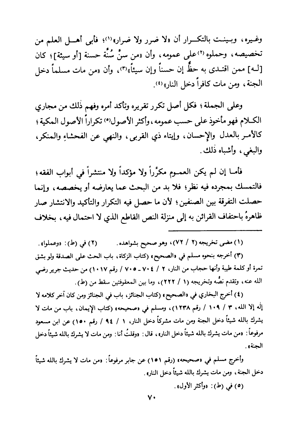 وَغَيْرِهِ، وَبَيَّنَتْ بِالتَّكْرَارِ أَنَّ "لَا ضَرَرَ وَلَا ضِرَارَ" 1؛ فَأَبَى أَهْلُ الْعِلْمِ مِنْ تَخْصِيصِهِ، وَحَمَلُوهُ2 عَلَى عُمُومِهِ، وَأَنَّ "مَنْ سَنَّ سُنَّةً حَسَنَةً [أَوْ سَيِّئَةً] ؛ كَانَ [لَهُ] مِمَّنِ اقْتَدَى بِهِ حَظٌّ إِنْ حَسَنًا وَإِنْ سَيِّئًا"3 وَأَنَّ "مَنْ مَاتَ مُسْلِمًا دَخَلَ الْجَنَّةَ، وَمَنْ مَاتَ كَافِرًا دَخَلَ النَّارَ"4.