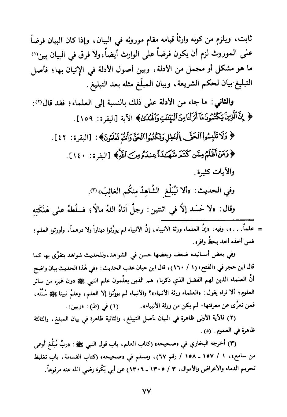 ثَابِتٌ، وَيَلْزَمُ مِنْ كَوْنِهِ وَارِثًا قِيَامُهُ مَقَامَ مَوْرُوثِهِ فِي الْبَيَانِ، وَإِذَا كَانَ الْبَيَانُ فَرْضًا عَلَى الْمَوْرُوثِ لَزِمَ أَنْ يَكُونَ فَرْضًا عَلَى الْوَارِثِ أَيْضًا، وَلَا فَرْقَ فِي الْبَيَانِ بَيْنَ1 مَا هُوَ مُشْكِلٌ أَوْ مُجْمَلٌ مِنَ الْأَدِلَّةِ، وَبَيْنَ أُصُولِ الْأَدِلَّةِ فِي الْإِتْيَانِ بِهَا؛ فَأَصْلُ التَّبْلِيغِ بَيَانٌ لِحُكْمِ الشَّرِيعَةِ، وَبَيَانُ الْمُبَلِّغِ مِثْلُهُ بَعْدَ التَّبْلِيغِ.