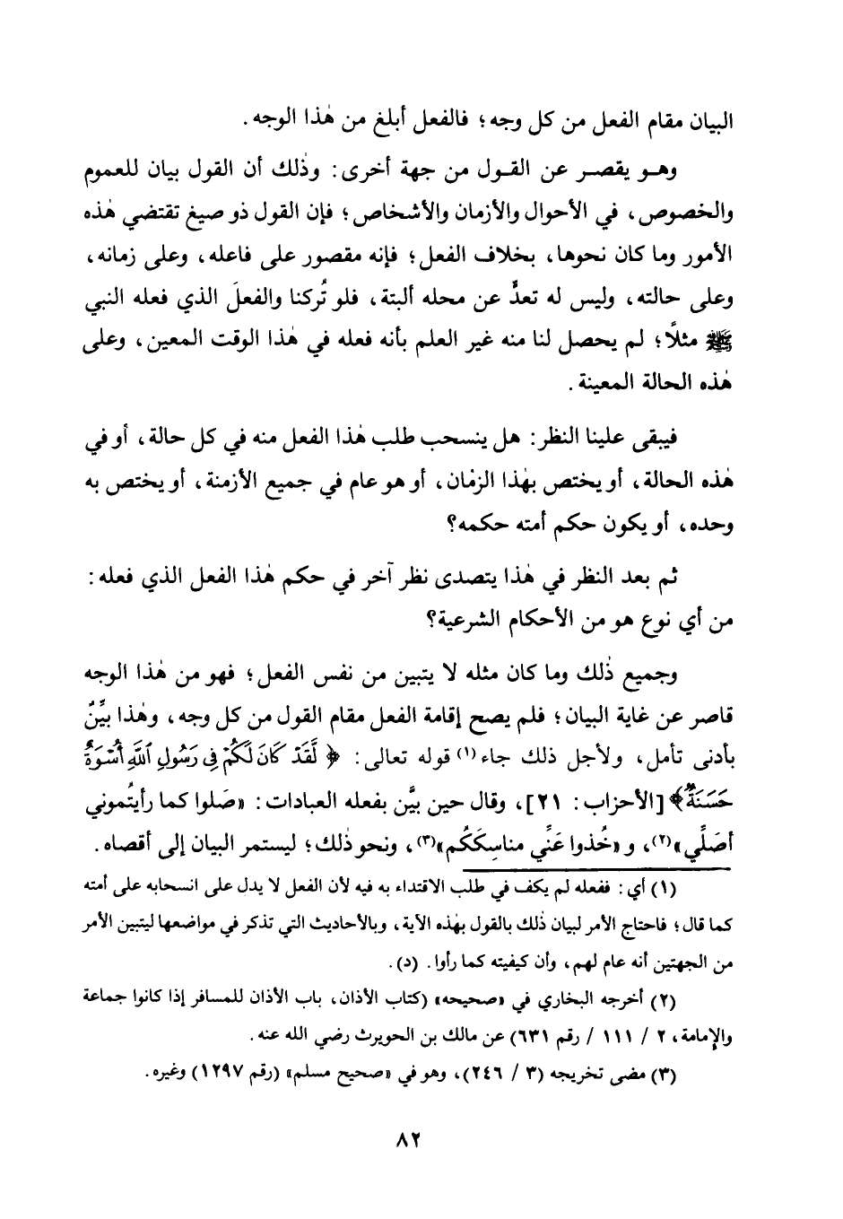 وَجَمِيعُ ذَلِكَ وَمَا كَانَ مِثْلَهُ لَا يَتَبَيَّنُ مِنْ نَفْسِ الْفِعْلِ؛ فَهُوَ مِنْ هَذَا الْوَجْهِ قَاصِرٌ عَنْ غَايَةِ الْبَيَانِ؛ فَلَمْ يَصِحَّ إِقَامَةُ الْفِعْلِ مَقَامَ الْقَوْلِ مِنْ كُلِّ وَجْهٍ، وَهَذَا بَيِّنٌ بِأَدْنَى تَأَمُّلٍ، وَلِأَجْلِ ذَلِكَ جَاءَ1 قَوْلُهُ تَعَالَى: {لَقَدْ كَانَ لَكُمْ فِي رَسُولِ اللَّهِ أُسْوَةٌ حَسَنَةٌ} [الْأَحْزَابِ: 21] ، وَقَالَ حِينَ بَيَّنَ بِفِعْلِهِ الْعِبَادَاتِ: "صَلُّوا كَمَا رَأَيْتُمُونِي أُصَلِّي" 2، وَ "خُذُوا عَنِّي مَنَاسِكَكُمْ" 3، وَنَحْوَ ذَلِكَ؛ لِيَسْتَمِرَّ الْبَيَانُ إِلَى أقصاه.