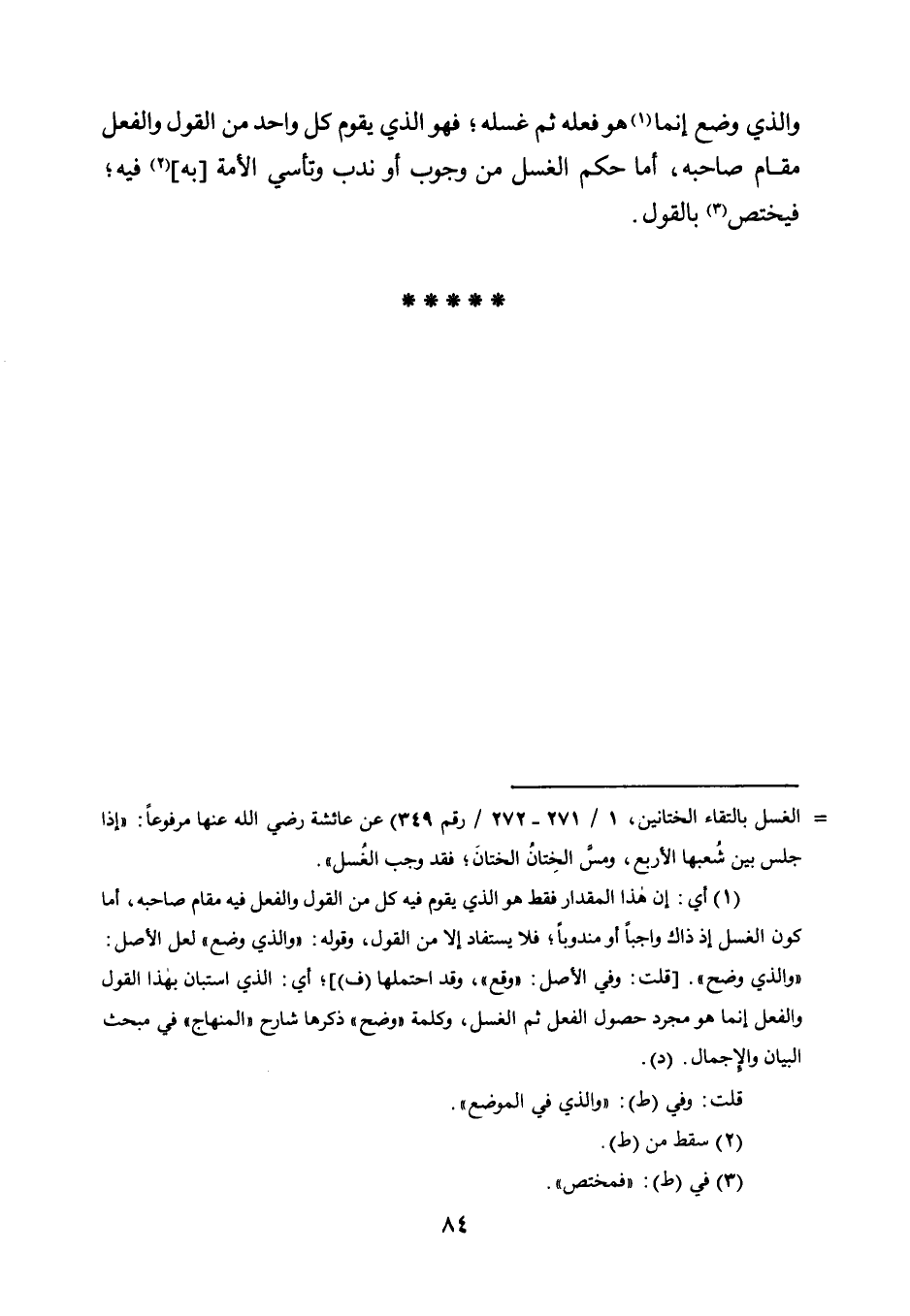 1 أي: إن هذا المقدار فقط هو الذي يقوم فيه كل من القول والفعل فيه مقام صاحبه، أما كون الغسل إذا ذاك واجبًا أو مندوبًا؛ فلا يستفاد إلا من القول، وقوله: "والذي وضع" لعل الأصل: "والذي وضح". [قلت: وفي الأصل: "وقع"، وقد احتملها "ف"] ؛ أي: الذي استبان بهذا القول والفعل إنما هو مجرد حصول الفعل ثم الغسل، وكلمة "وضح" ذكرها شارح "المنهاج" في مبحث البيان والإجمال. "د".