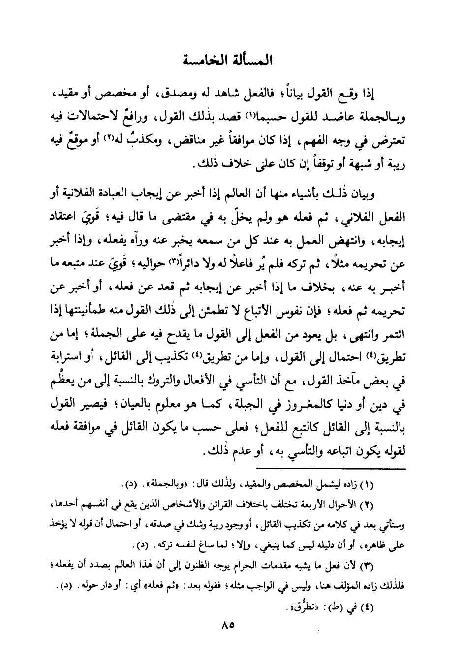 2 الأحوال الأربعة تختلف باختلاف القرائن والأشخاص الذين يقع في أنفسهم أحدها، وستأتي بعد في كلامه من تكذيب القائل، أو وجود ريبة وشك في صدقه، أو احتمال أن قوله لا يؤخذ على ظاهره، أو أن دليله ليس كما ينبغي، وإلا لما ساغ لنفسه تركه. "د".