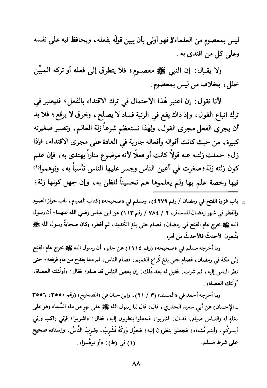 لِأَنَّا نَقُولُ: إِنِ اعْتُبِرَ هَذَا الِاحْتِمَالُ فِي تَرْكِ الِاقْتِدَاءِ بِالْفِعْلِ؛ فَلْيُعْتَبَرْ فِي تَرْكِ اتِّبَاعِ الْقَوْلِ، وَإِذْ ذَاكَ يَقَعُ فِي الرُّتْبَةِ فَسَادٌ لَا يُصْلَحُ، وخرق لا يرقع؛ فلا بد أَنْ يَجْرِيَ الْفِعْلُ مَجْرَى الْقَوْلِ، وَلِهَذَا تُسْتَعْظَمُ شَرْعًا زَلَّةُ الْعَالِمِ، وَتَصِيرُ صَغِيرَتُهُ كَبِيرَةً، مِنْ حَيْثُ كَانَتْ أَقْوَالُهُ وَأَفْعَالُهُ جَارِيَةً فِي الْعَادَةِ عَلَى مَجْرَى الِاقْتِدَاءِ، فَإِذَا زَلَّ؛ حُمِلَتْ زَلَّتُهُ عَنْهُ قَوْلًا كَانَتْ أَوْ فِعْلًا لِأَنَّهُ مَوْضُوعٌ مَنَارًا يُهْتَدَى بِهِ، فَإِنْ عُلِمَ كَوْنُ زَلَّتِهِ زَلَّةً؛ صَغُرَتْ فِي أَعْيُنِ النَّاسِ وَجَسَرَ عَلَيْهَا النَّاسُ تَأَسِّيًا بِهِ، وَتَوَهَّمُوا1 فِيهَا رُخْصَةً عَلِمَ بِهَا وَلَمْ يَعْلَمُوهَا هُمْ تَحْسِينًا لِلظَّنِّ بِهِ، وإن جهل كونها زلة؛
