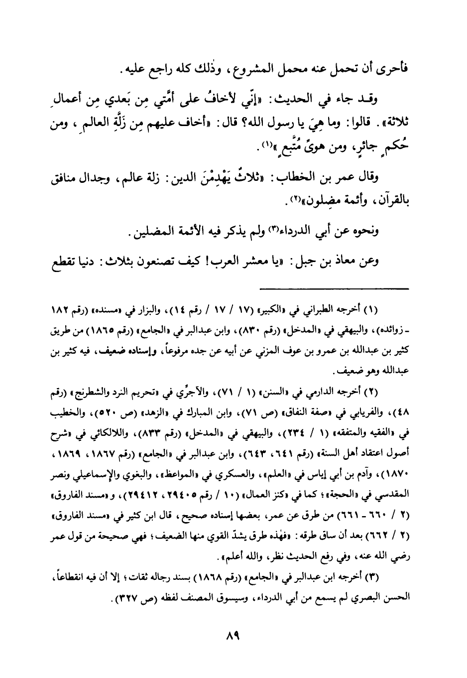 وَقَدْ جَاءَ فِي الْحَدِيثِ: "إِنِّي لَأَخَافُ عَلَى أُمَّتِي مِنْ بَعْدِي مِنْ أَعْمَالٍ ثَلَاثَةٍ". قَالُوا: وَمَا هِيَ يَا رَسُولَ اللَّهِ؟ قَالَ: "أَخَافُ عَلَيْهِمْ مِنْ زَلَّةِ الْعَالِمِ, وَمِنْ حُكْمِ جَائِرٍ، وَمِنْ هَوًى مُتَّبَعٍ"1.