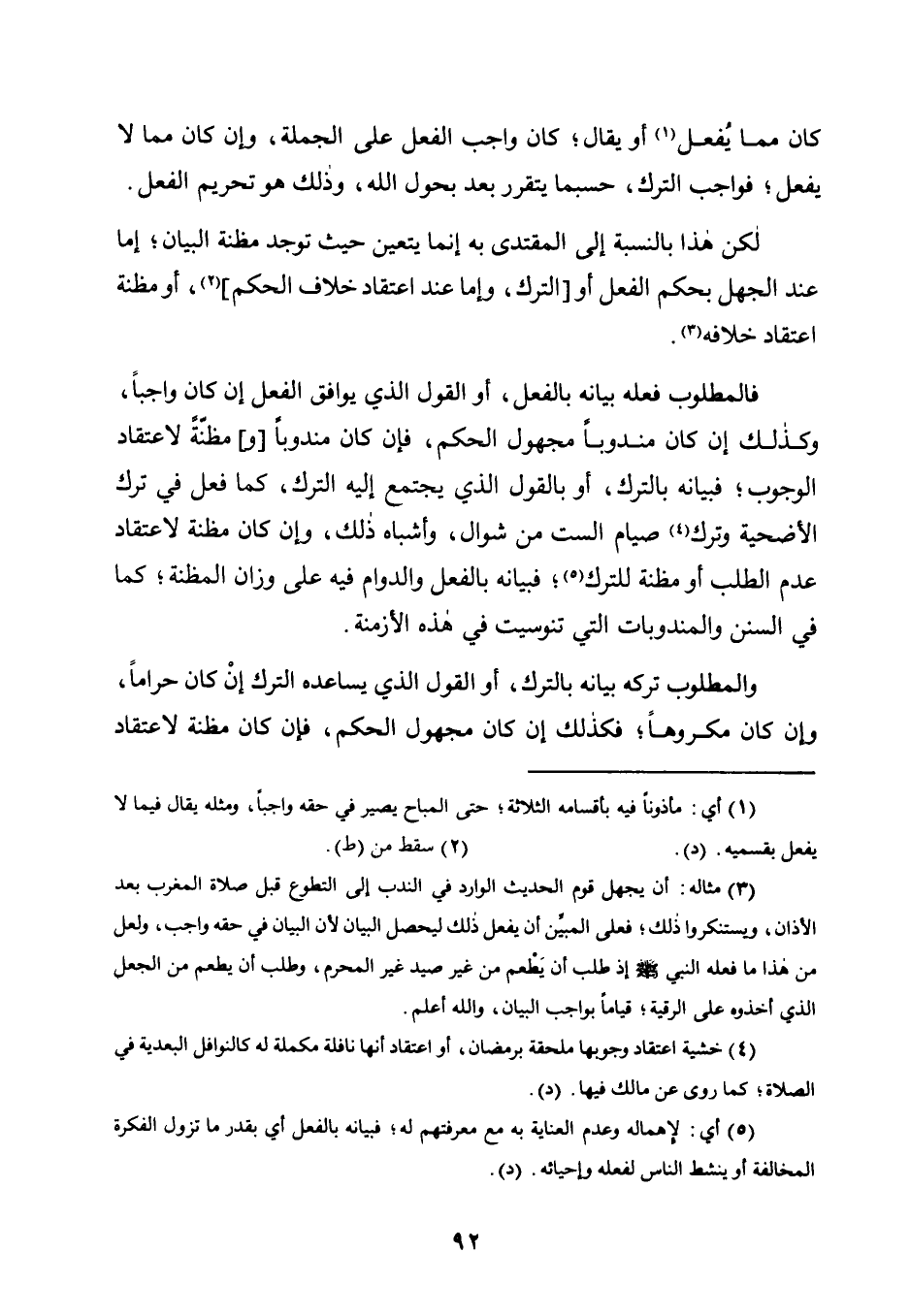 فَالْمَطْلُوبُ فِعْلُهُ بَيَانُهُ بِالْفِعْلِ، أَوِ الْقَوْلِ الَّذِي يُوَافِقُ الْفِعْلَ إِنْ كَانَ وَاجِبًا، وَكَذَلِكَ إِنْ كَانَ مَنْدُوبًا مجهول الحكم، فإن كان مندوبًا [و] مظنة لِاعْتِقَادِ الْوُجُوبِ؛ فَبَيَانُهُ بِالتَّرْكِ أَوْ بِالْقَوْلِ الَّذِي يَجْتَمِعُ إِلَيْهِ التَّرْكُ، كَمَا فَعَلَ فِي تَرْكِ الْأُضْحِيَّةِ وَتَرْكِ4 صِيَامِ السِّتِّ مِنْ شَوَّالٍ، وَأَشْبَاهِ ذَلِكَ، وَإِنْ كَانَ مَظِنَّةً لِاعْتِقَادِ عَدَمِ الطَّلَبِ أَوْ مَظِنَّةً لِلتَّرْكِ5؛ فَبَيَانُهُ بِالْفِعْلِ وَالدَّوَامِ فِيهِ عَلَى وَزَانِ الْمَظِنَّةِ؛ كَمَا فِي السُّنَنِ وَالْمَنْدُوبَاتِ الَّتِي تُنُوسِيَتْ فِي هَذِهِ الْأَزْمِنَةِ.