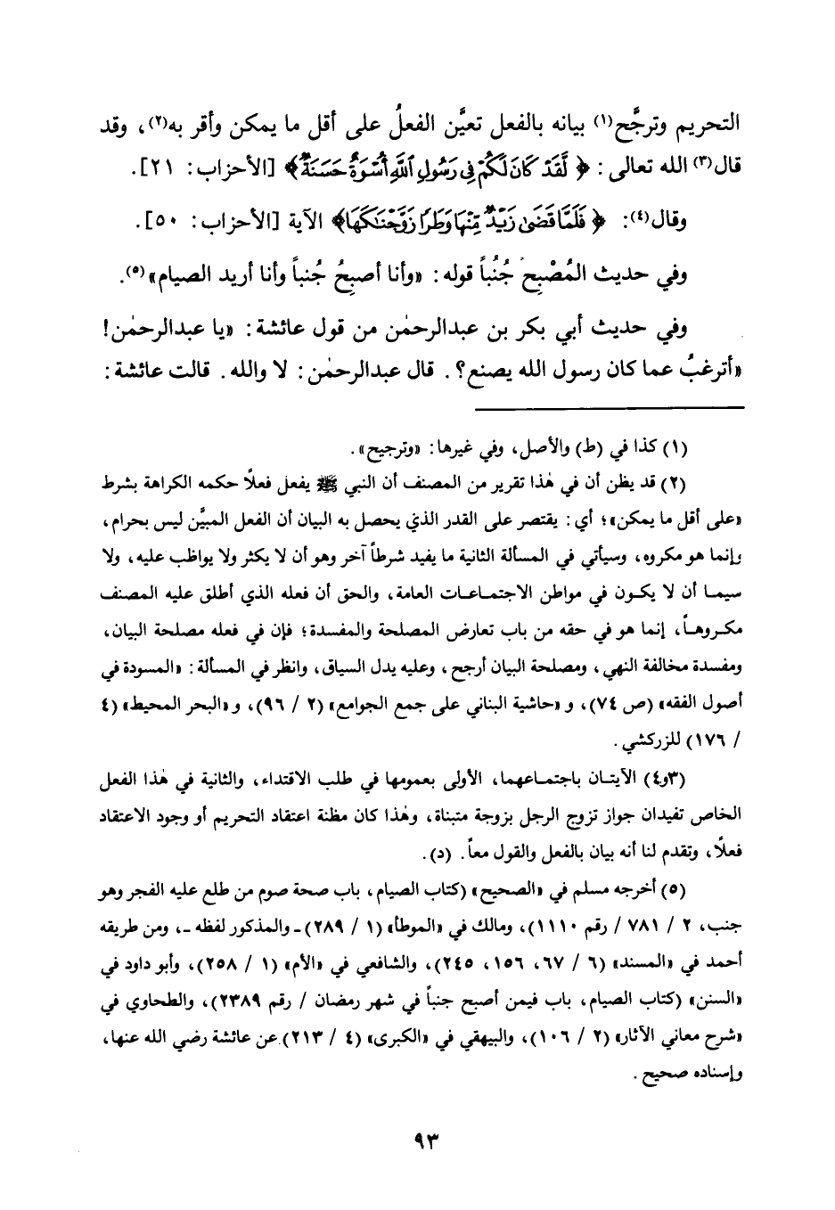 التَّحْرِيمِ وَتَرَجَّحَ1 بَيَانُهُ بِالْفِعْلِ تَعَيَّنَ الْفِعْلُ عَلَى أَقَلِّ مَا يُمْكِنُ وَأَقْرَّ بِهِ2، وَقَدْ قَالَ3 اللَّهُ تَعَالَى: {لَقَدْ كَانَ لَكُمْ فِي رَسُولِ اللَّهِ أُسْوَةٌ حَسَنَةٌ} [الْأَحْزَابِ: 21] .