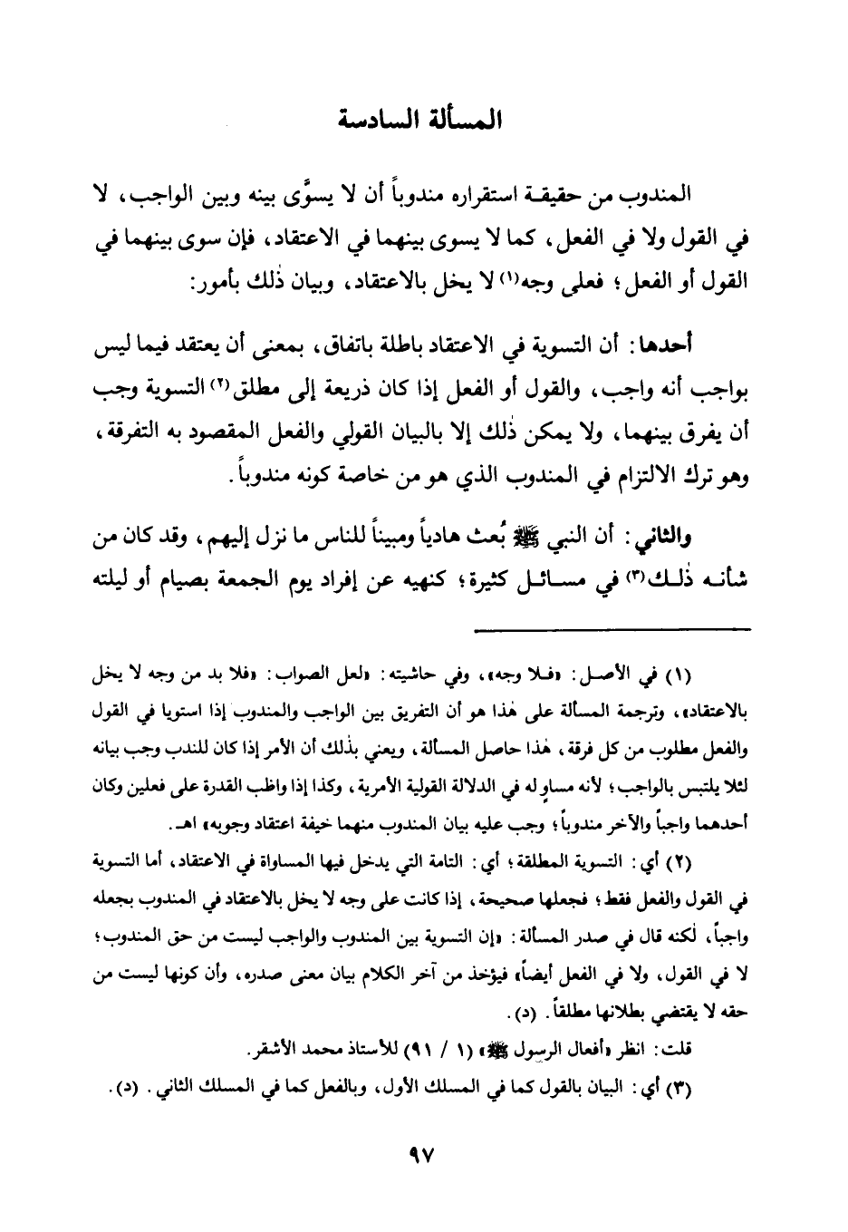 الْمَنْدُوبُ مِنْ حَقِيقَةِ اسْتِقْرَارِهِ مَنْدُوبًا أَنْ لَا يُسَوَّى بَيْنَهُ وَبَيْنَ الْوَاجِبِ، لَا فِي الْقَوْلِ وَلَا فِي الْفِعْلِ، كَمَا لَا يُسَوَّى بَيْنَهُمَا فِي الِاعْتِقَادِ، فَإِنْ سُوِيَّ بَيْنَهُمَا فِي الْقَوْلِ أَوِ الْفِعْلِ؛ فَعَلَى وَجْهٍ1 لَا يُخِلُّ بِالِاعْتِقَادِ، وَبَيَانُ ذَلِكَ بِأُمُورٍ: