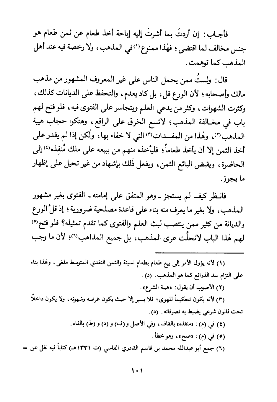 فَانْظُرْ كَيْفَ لَمْ يَسْتَجِزْ -وَهُوَ الْمُتَّفَقُ عَلَى إِمَامَتِهِ- الْفَتْوَى بِغَيْرِ مَشْهُورِ الْمَذْهَبِ، وَلَا بِغَيْرِ مَا يُعْرَفُ مِنْهُ بِنَاءً عَلَى قَاعِدَةٍ مَصْلَحِيَّةٍ ضَرُورِيَّةٍ؛ إِذْ قَلَّ الْوَرَعُ وَالدِّيَانَةُ مِنْ كَثِيرٍ مِمَّنْ يَنْتَصِبُ لُبْثَ الْعِلْمِ وَالْفَتْوَى كَمَا تَقَدَّمَ تَمْثِيلُهُ؟ فَلَوْ فُتِحَ5 لَهُمْ هَذَا الْبَابُ لَانْحَلَّتْ عُرَى الْمَذْهَبِ، بَلْ جَمِيعُ الْمَذَاهِبِ6؛ لِأَنَّ مَا وَجَبَ لِلشَّيْءِ وَجَبَ لِمِثْلِهِ، وَظَهَرَ أَنَّ تِلْكَ الضَّرُورَةَ الَّتِي ادعيت في السؤال ليست بضرورة.