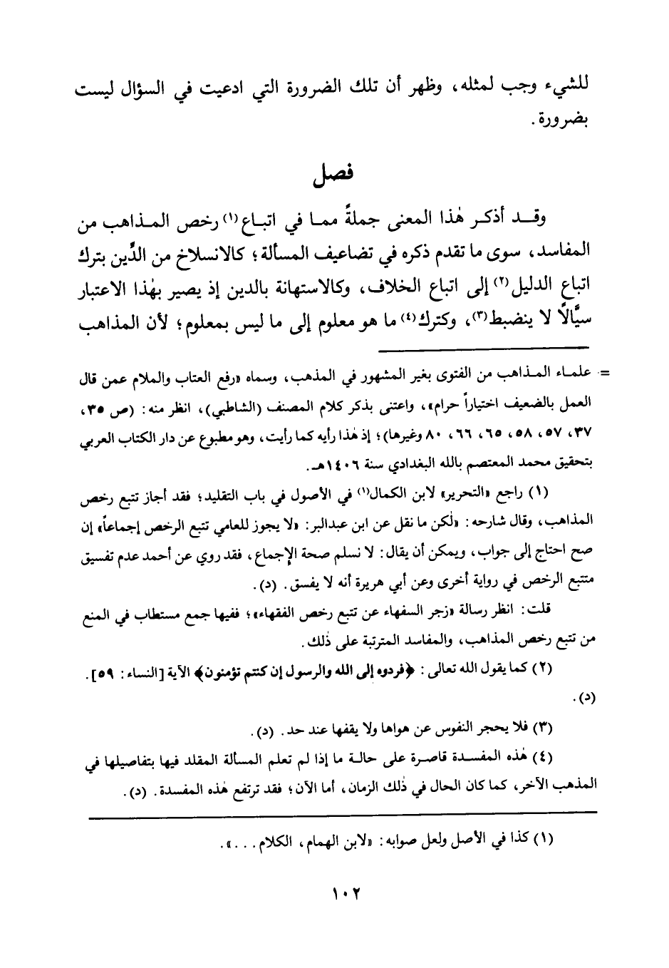4 هذه المفسدة قاصرة على حالة ما إذا لم تعلم المسألة المقلد فيها بتفاصليها في المذهب الآخر، كما كان الحال في ذلك الزمان، أما الآن؛ فقد ترتفع هذه المفسدة. "د".