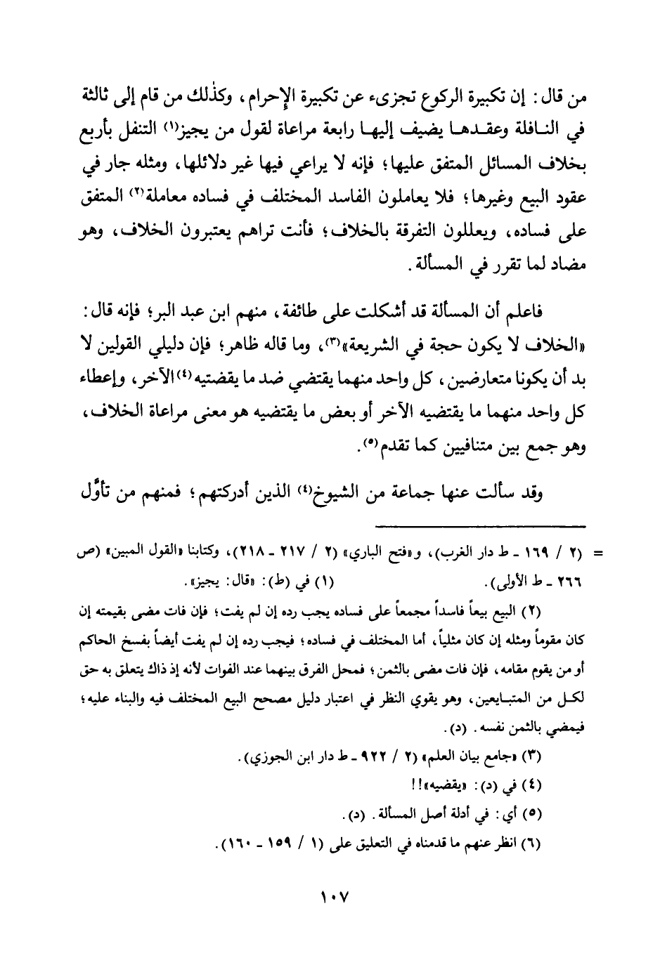 مَنْ قَالَ: إِنَّ تَكْبِيرَةَ الرُّكُوعِ تُجْزِئُ عَنْ تَكْبِيرَةِ الْإِحْرَامِ، وَكَذَلِكَ مَنْ قَامَ إِلَى ثَالِثَةٍ فِي النَّافِلَةِ وَعَقَدَهَا يُضِيفُ إِلَيْهَا رَابِعَةً مُرَاعَاةً لِقَوْلِ مَنْ يُجِيزُ1 التَّنَفُّلَ بِأَرْبَعٍ بِخِلَافِ الْمَسَائِلِ الْمُتَّفَقِ عَلَيْهَا؛ فَإِنَّهُ لَا يُرَاعِي فِيهَا غَيْرَ دَلَائِلِهَا، وَمِثْلُهُ جَارٍ فِي عُقُودِ الْبَيْعِ وَغَيْرِهَا؛ فَلَا يُعَامِلُونَ الْفَاسِدَ الْمُخْتَلَفَ فِي فَسَادِهِ مُعَامَلَةَ2 الْمُتَّفَقِ عَلَى فَسَادِهِ، وَيُعَلِّلُونَ التَّفْرِقَةَ بِالْخِلَافِ؛ فَأَنْتَ تَرَاهُمْ يَعْتَبِرُونَ الْخِلَافَ، وَهُوَ مُضَادٌّ لِمَا تَقَرَّرَ فِي الْمَسْأَلَةِ.