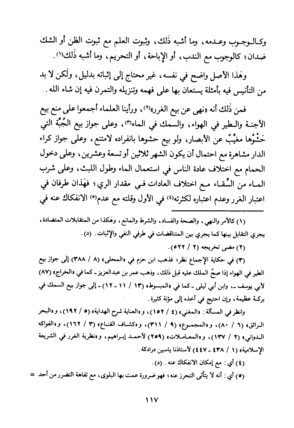 فَمِنْ ذَلِكَ أَنَّهُ "نَهَى عَنْ بَيْعِ الْغَرَرِ"2، وَرَأَيْنَا الْعُلَمَاءَ أَجْمَعُوا عَلَى مَنْعِ بَيْعِ الْأَجِنَّةِ وَالطَّيْرِ فِي الْهَوَاءِ، وَالسَّمَكِ فِي الْمَاءِ3، وَعَلَى جَوَازِ بَيْعِ الْجُبَّةِ الَّتِي حَشْوُهَا مُغَيَّبٌ عَنِ الْأَبْصَارِ، وَلَوْ بِيعَ حَشْوُهَا بِانْفِرَادِهِ لَامْتُنِعَ، وَعَلَى جَوَازِ كِرَاءِ الدَّارِ مُشَاهَرَةً مَعَ احْتِمَالِ أَنْ يَكُونَ الشَّهْرُ ثَلَاثِينَ أَوْ تِسْعَةً وَعِشْرِينَ، وَعَلَى دُخُولِ الْحَمَّامِ مَعَ اخْتِلَافِ عَادَةِ النَّاسِ فِي اسْتِعْمَالِ الْمَاءِ وَطُولِ اللُّبْثِ، وَعَلَى شُرْبِ الْمَاءِ مِنَ السِّقَاءِ مَعَ اخْتِلَافِ الْعَادَاتِ فِي مِقْدَارِ الرِّيِّ؛ فَهَذَانِ طَرَفَانِ فِي اعْتِبَارِ الْغَرَرِ وَعَدَمِ اعْتِبَارِهِ لِكَثْرَتِهِ4 فِي الْأَوَّلِ وَقِلَّتِهِ مَعَ عدم5 الانفكاك عنه في