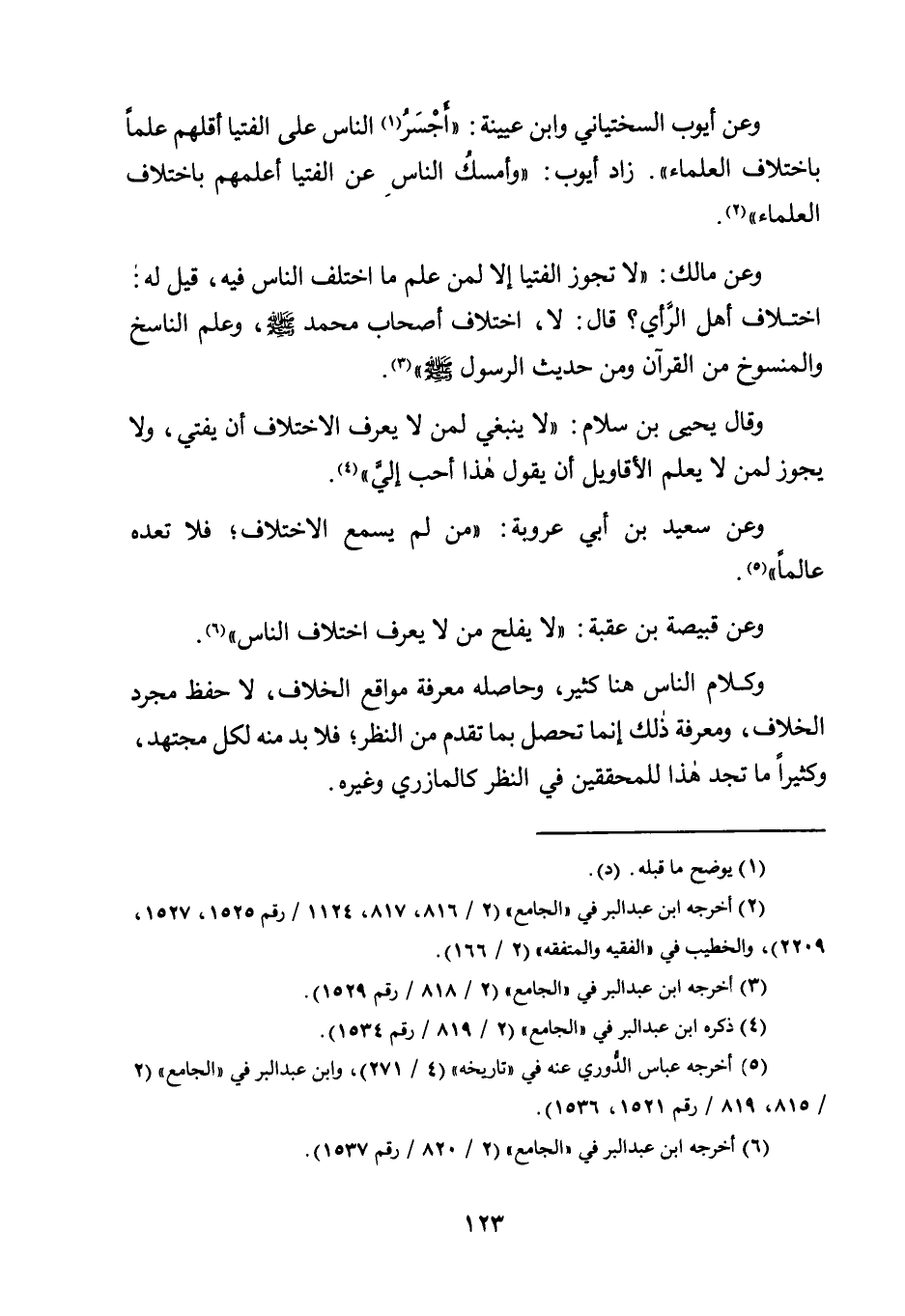 وَعَنْ مَالِكٍ: "لَا تَجُوزُ الْفُتْيَا إِلَّا لِمَنْ عَلِمَ مَا اخْتَلَفَ النَّاسُ فِيهِ، قِيلَ لَهُ: اخْتِلَافَ أَهْلِ الرَّأي؟ قَالَ: لَا، اخْتِلَافَ أَصْحَابِ مُحَمَّدٍ صَلَّى اللَّهُ عَلَيْهِ وَسَلَّمَ، وَعَلِمَ النَّاسِخَ وَالْمَنْسُوخَ مِنَ الْقُرْآنِ وَمِنْ حَدِيثِ الرَّسُولِ الله صَلَّى اللَّهُ عَلَيْهِ وَسَلَّمَ"3.