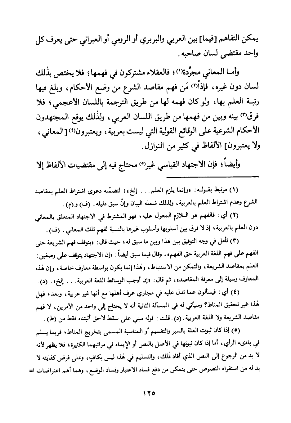 وَأَمَّا الْمَعَانِي مجرَّدة1؛ فَالْعُقَلَاءُ مُشْتَرِكُونَ فِي فَهْمِهَا، فَلَا يَخْتَصُّ بِذَلِكَ لِسَانٌ دون غيره، فإذن2 مَنْ فَهِمَ مَقَاصِدَ الشَّرْعِ مِنْ وَضْعِ الْأَحْكَامِ، وَبَلَغَ فِيهَا رُتْبَةَ الْعِلْمِ بِهَا، وَلَوْ كَانَ فَهْمُهُ لَهَا مِنْ طَرِيقِ التَّرْجَمَةِ بِاللِّسَانِ الْأَعْجَمِيِّ؛ فَلَا فَرْقَ3 بَيْنَهُ وَبَيْنَ مَنْ فَهِمَهَا مِنْ طَرِيقِ اللِّسَانِ الْعَرَبِيِّ، وَلِذَلِكَ يُوقِعُ الْمُجْتَهِدُونَ الْأَحْكَامَ الشَّرْعِيَّةَ عَلَى الْوَقَائِعِ الْقَوْلِيَّةِ الَّتِي لَيْسَتْ بِعَرَبِيَّةٍ، ويعتبرون4 [المعاني، ولا يتعبرون] الْأَلْفَاظَ فِي كَثِيرٍ مِنَ النَّوَازِلِ.